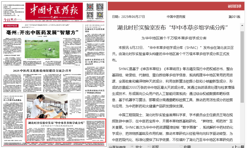 中国中医药报头版:湖北时珍实验室发布“华中本草多组学成分库” 为华中地区首个千万级本草多组学成分库