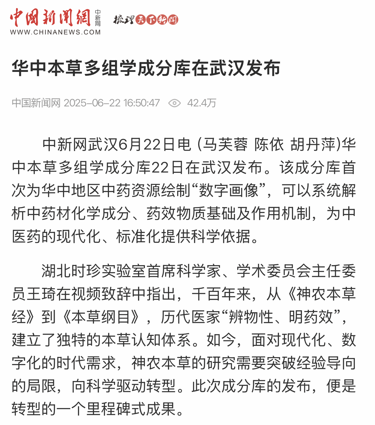 湖北日报客户端:首次为华中中药资源绘制“数字画像” 湖北时珍实验室发布千万级本草多组学成分库