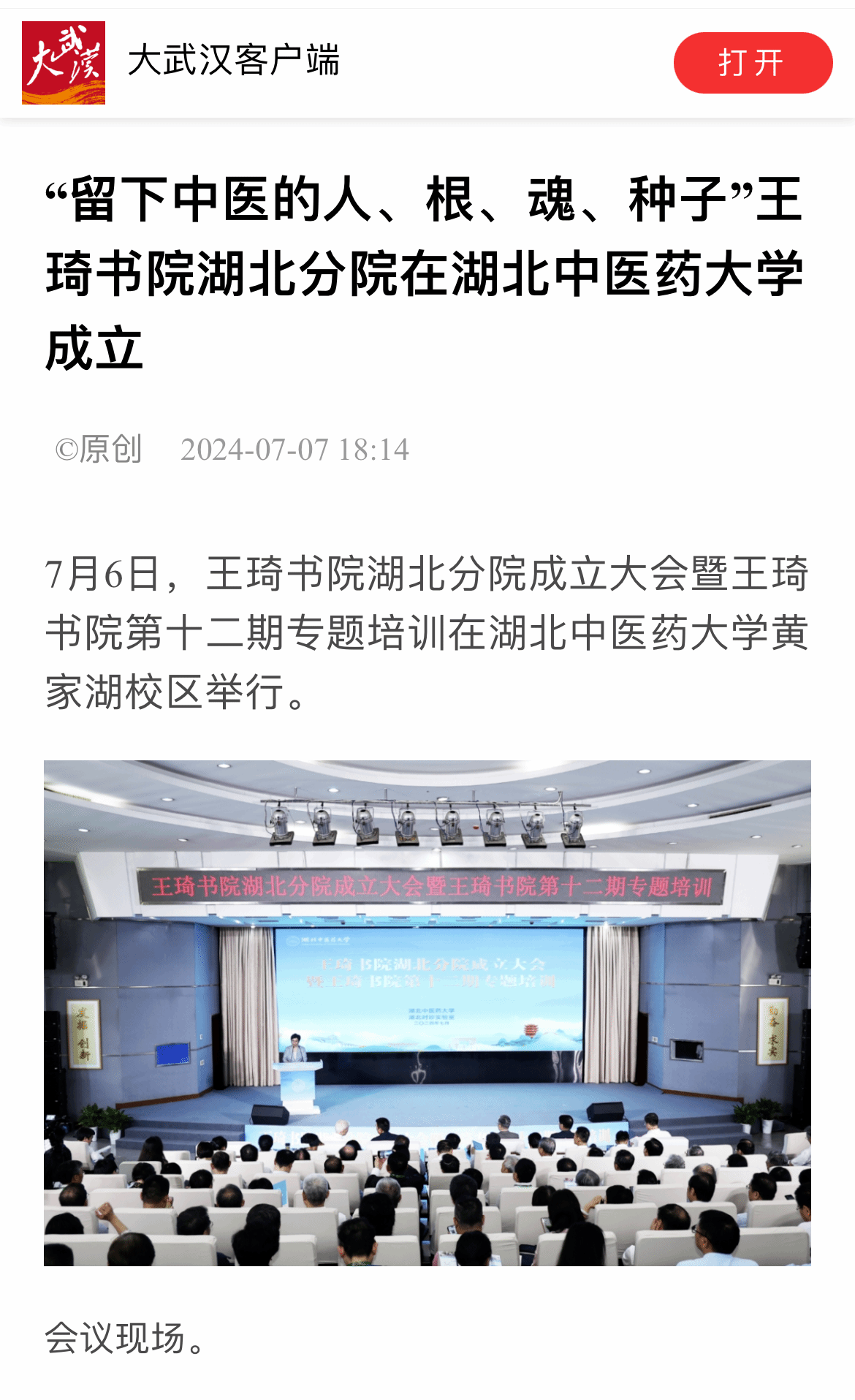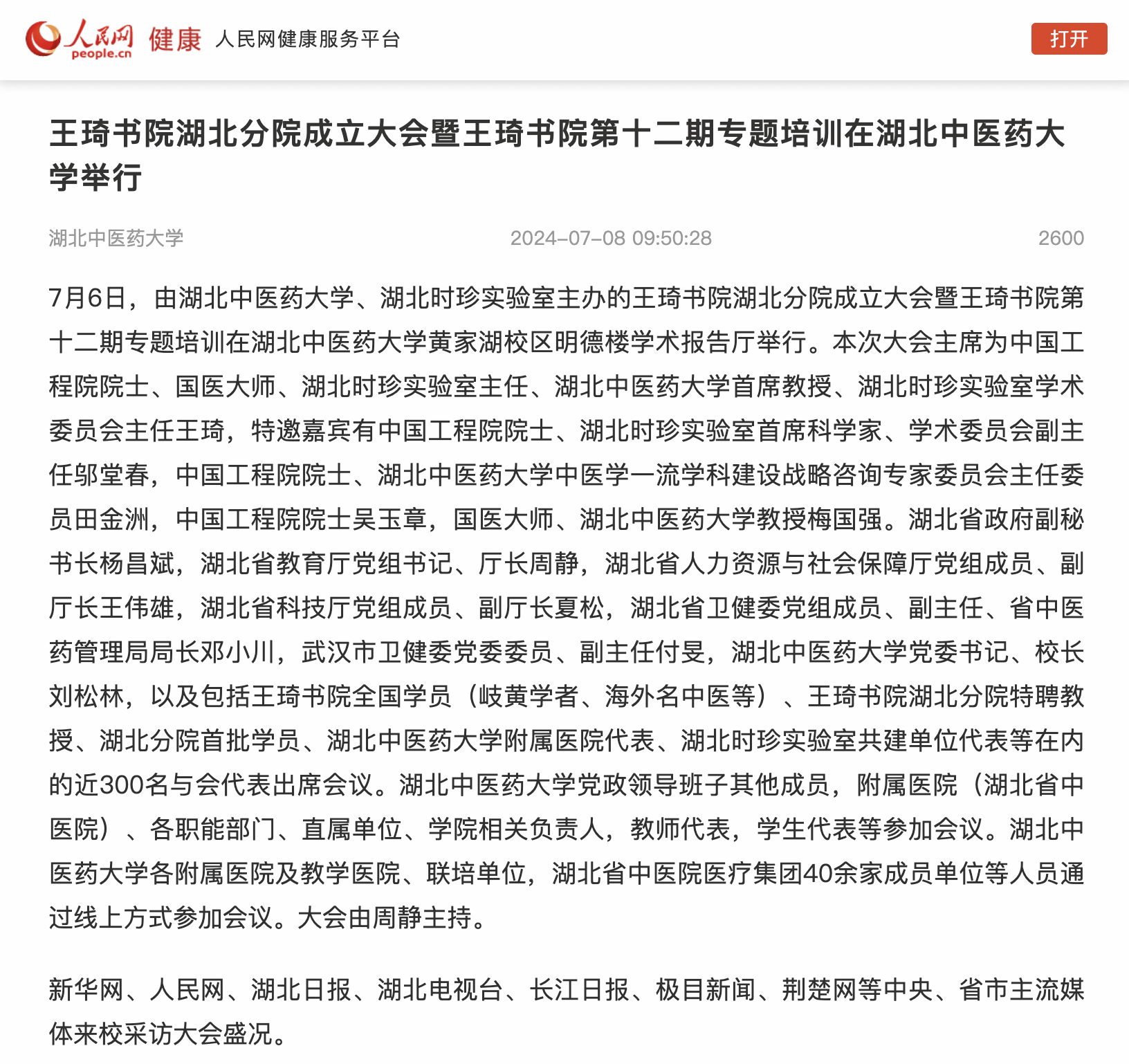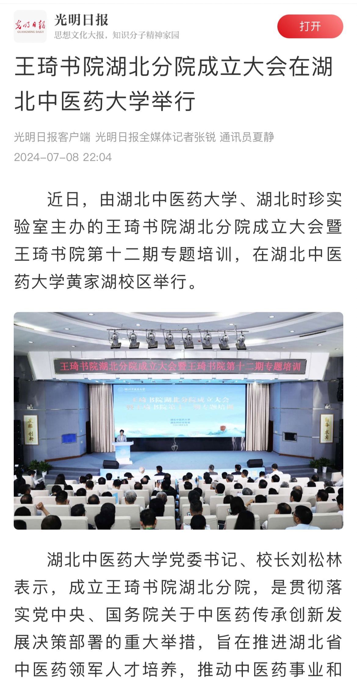 本网讯 7月6日至7日,由湖北中医药大学、湖北时珍实验室主办的王琦书院湖北分院成立大会暨王琦书院第十二期专题培训、王琦书院湖北分院开班典礼举行。新华网、人民网、学习强国学习平台、光明日报、科技日报、健康报、中国中医药报2版、中国中医药报官方号、湖北省人民政府网、湖北日报要闻版、湖北新闻、长江日报、极目新闻、荆楚网、湖北教育新闻网、长江云等中央、省市主流媒体,分别以《培养中医药领军人才 王琦书院湖北分院在湖北中医药大学揭牌成立》《王琦书院湖北分院成立大会暨王琦书院第十二期专题培训在湖北中医药大学举行》《王琦书院湖北分院举行开班典礼》等为题进行了详细报道,引发各界广泛关注,新华网报道阅读量近50万。