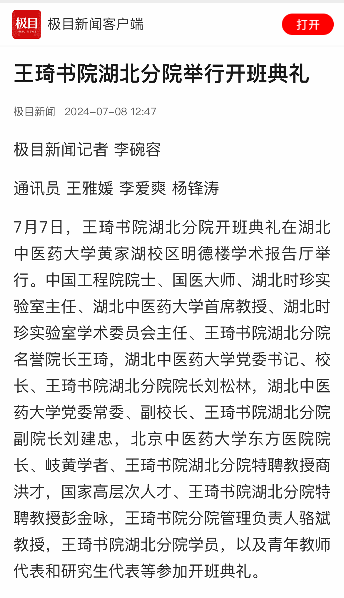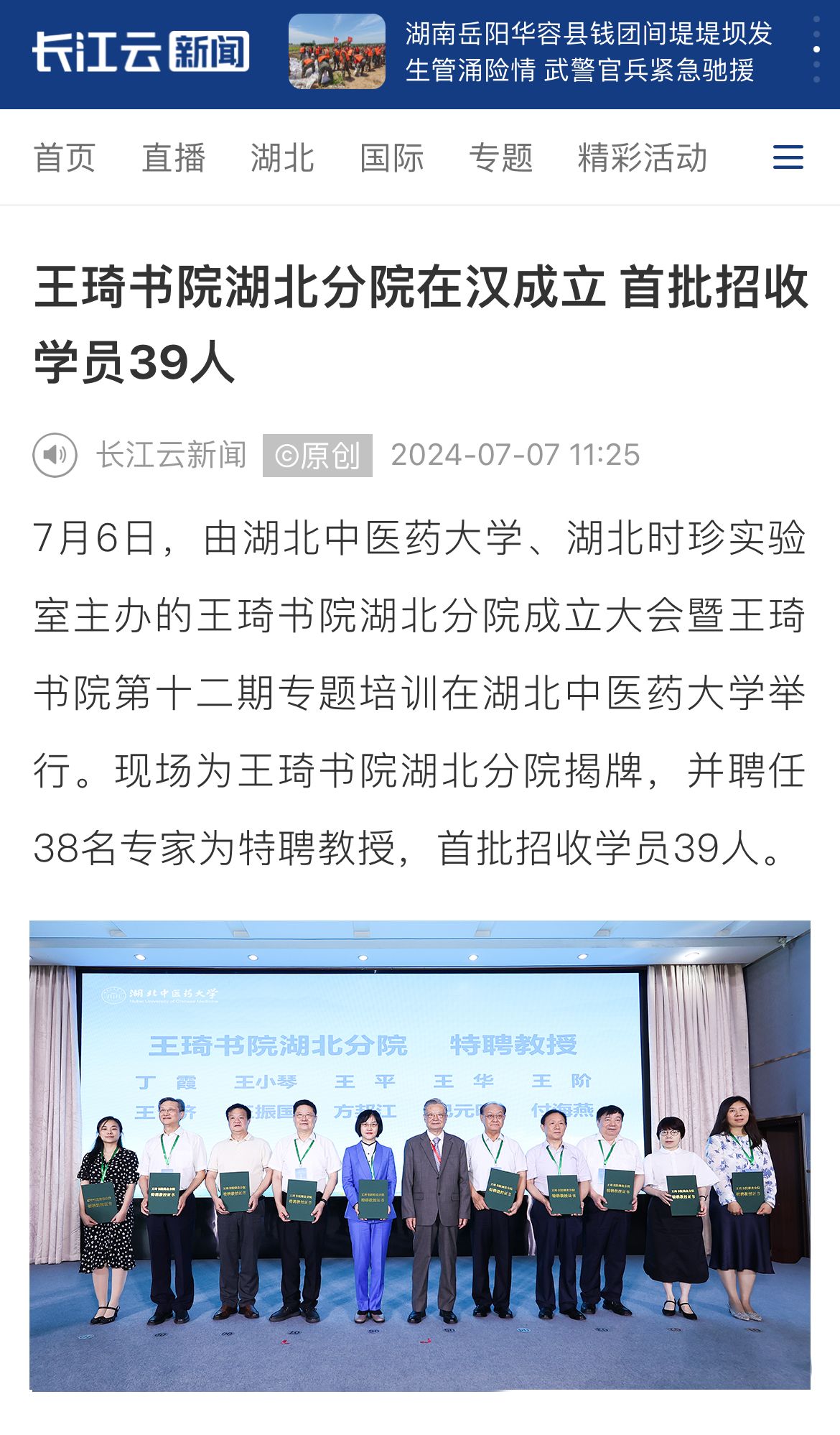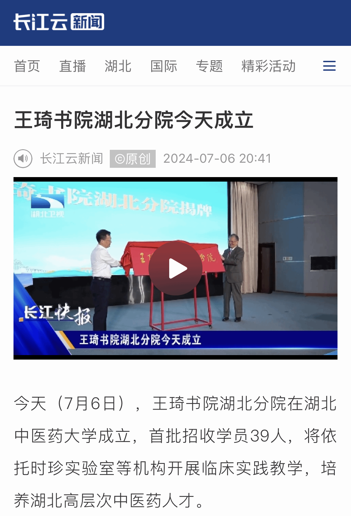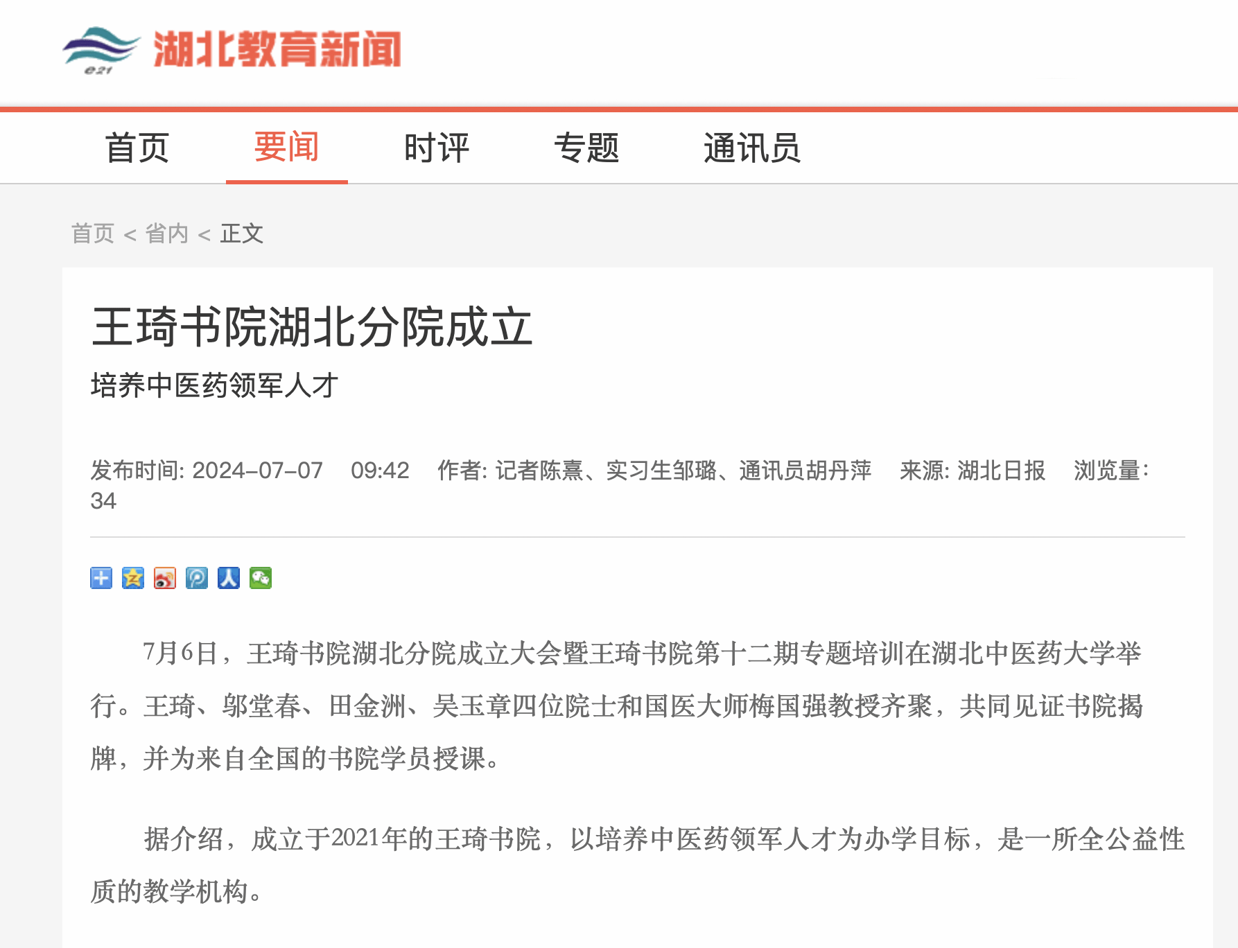 本网讯 7月6日至7日,由湖北中医药大学、湖北时珍实验室主办的王琦书院湖北分院成立大会暨王琦书院第十二期专题培训、王琦书院湖北分院开班典礼举行。新华网、人民网、学习强国学习平台、光明日报、科技日报、健康报、中国中医药报2版、中国中医药报官方号、湖北省人民政府网、湖北日报要闻版、湖北新闻、长江日报、极目新闻、荆楚网、湖北教育新闻网、长江云等中央、省市主流媒体,分别以《培养中医药领军人才 王琦书院湖北分院在湖北中医药大学揭牌成立》《王琦书院湖北分院成立大会暨王琦书院第十二期专题培训在湖北中医药大学举行》《王琦书院湖北分院举行开班典礼》等为题进行了详细报道,引发各界广泛关注,新华网报道阅读量近50万。