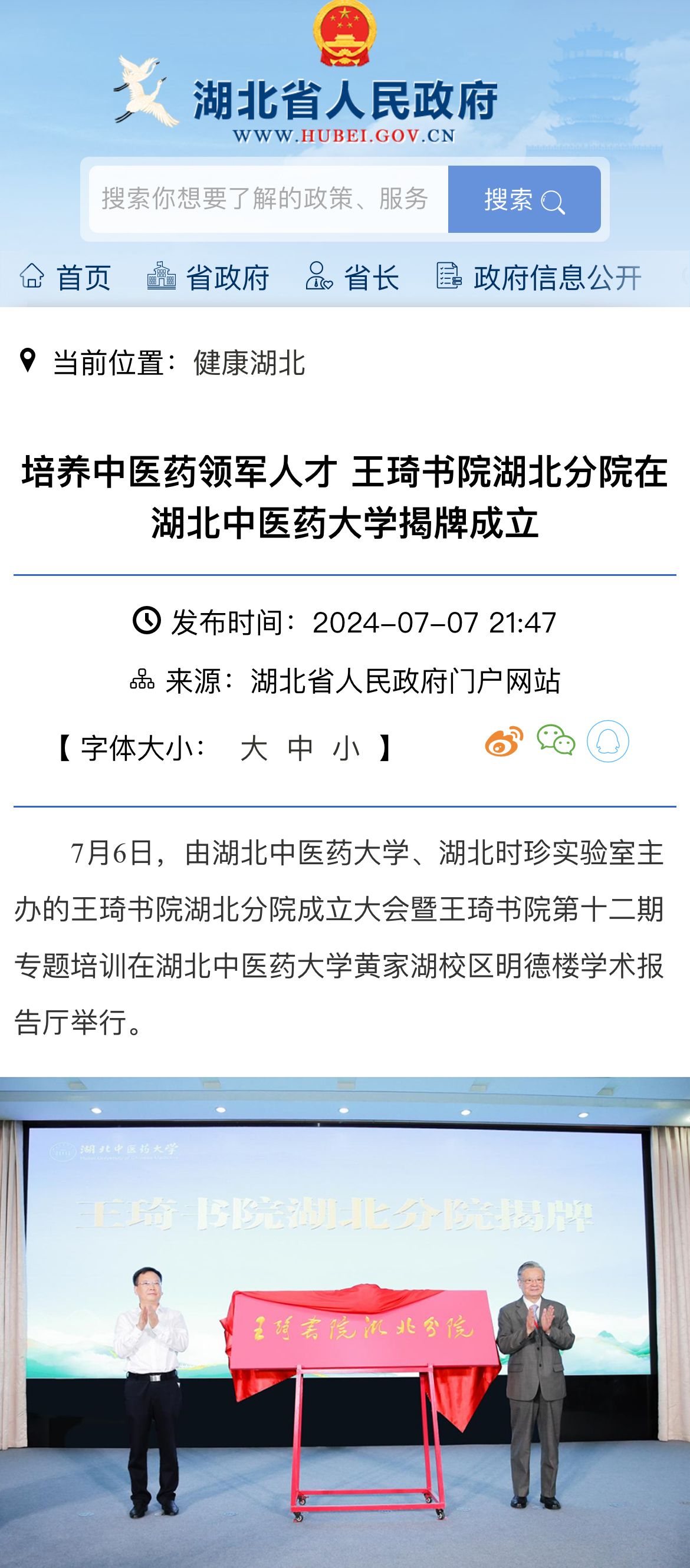 湖北省人民政府官网:培养中医药领军人才 王琦书院湖北分院在湖北中医大学揭牌成立