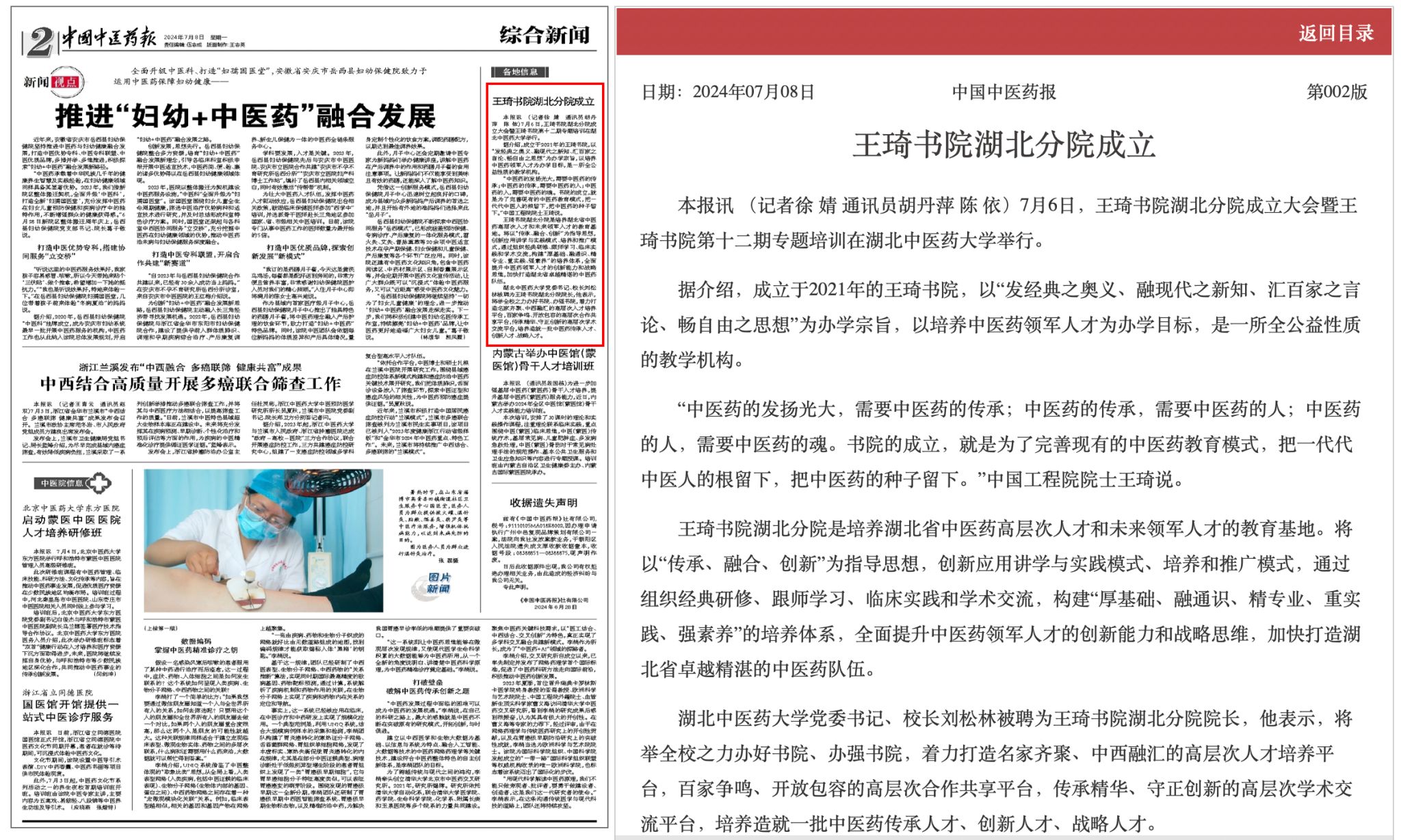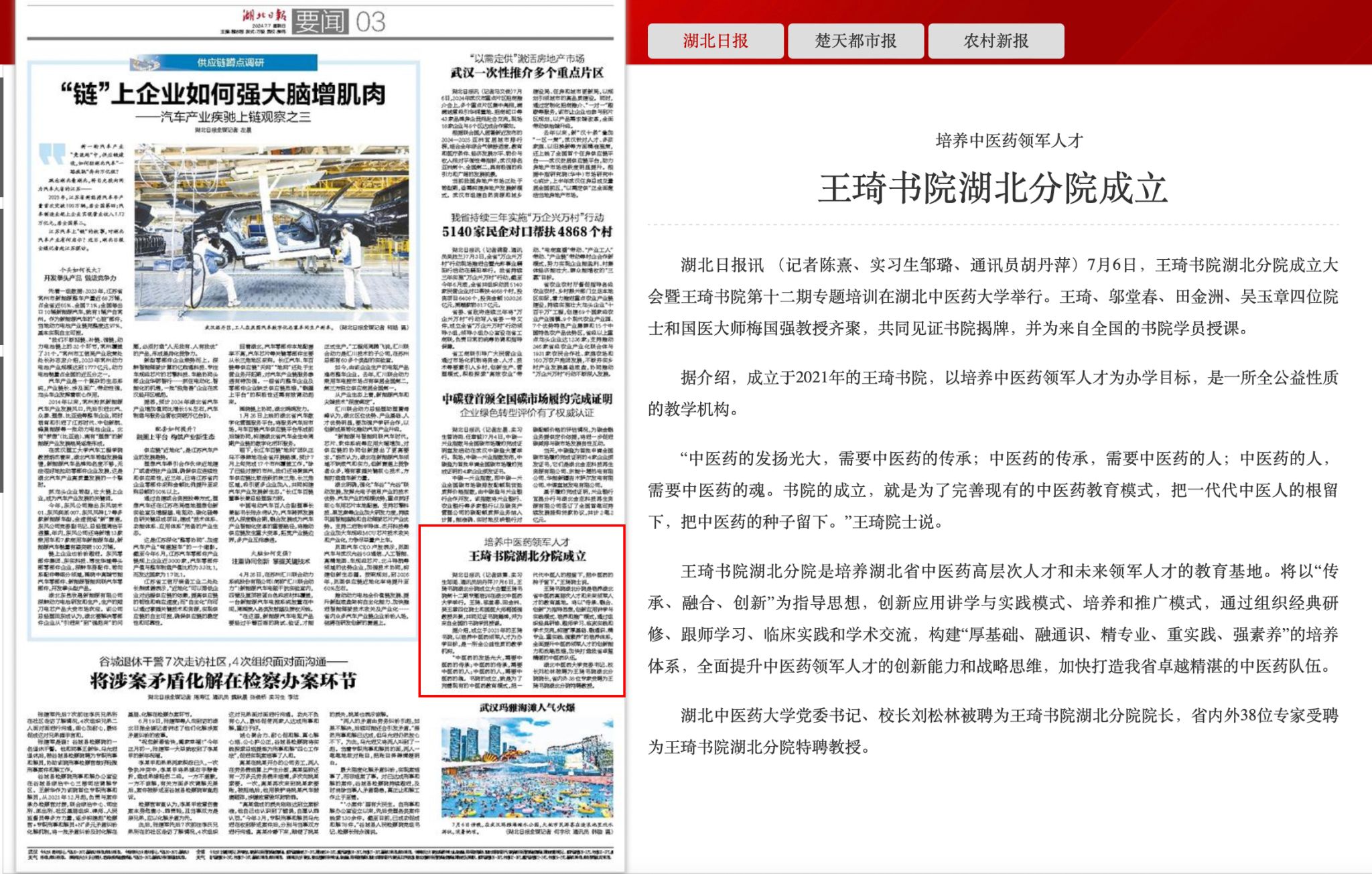 湖北日报要闻版:培养中医药领军人才 王琦书院湖北分院成立