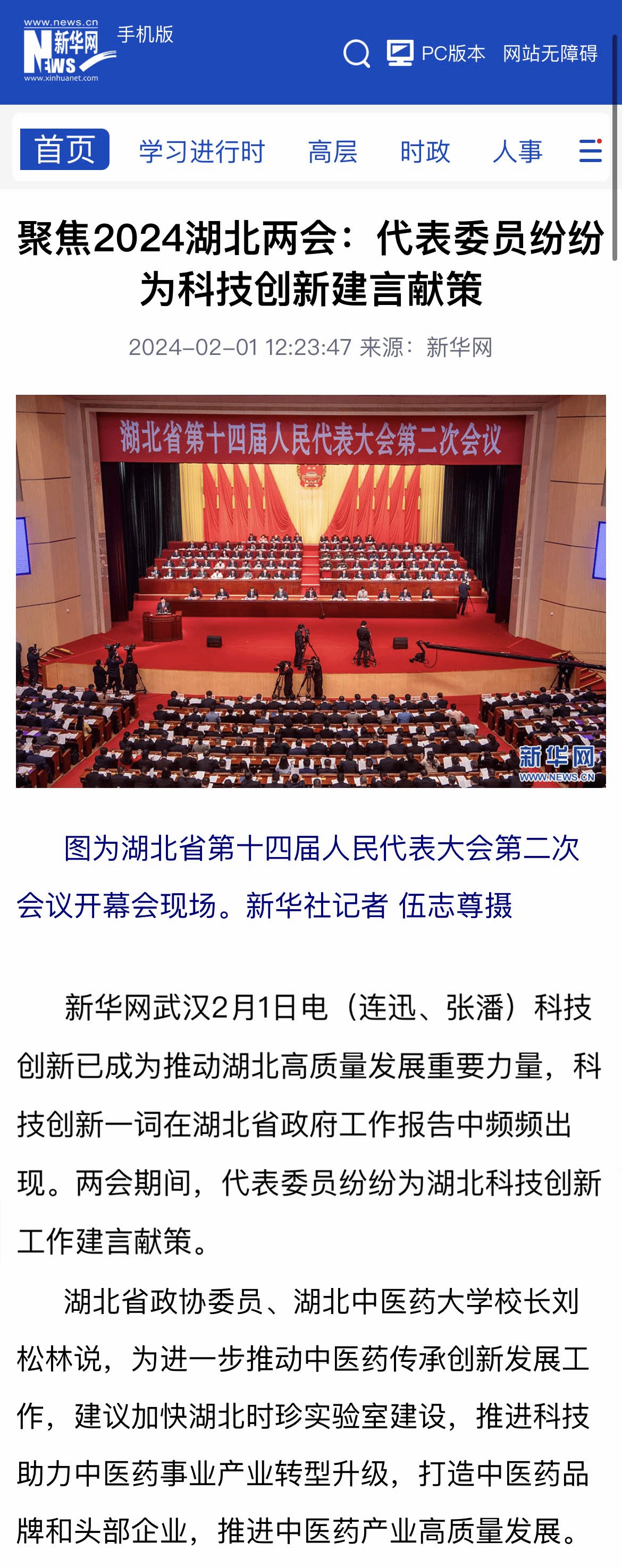 本网讯 科技创新已成为推动湖北高质量发展重要力量,科技创新一词在湖北省政府工作报告中频频出现。两会期间,代表委员纷纷为湖北科技创新工作建言献策。湖北省政协委员、我校校长刘松林先后受邀参加省两会第二场新闻发布会,介绍湖北中医药传承创新发展情况并回答记者提问;在省政协十三届二次会议联组会上发言,就发展中药材种业等提出意见建议。2月1日,新华网以“聚焦2024湖北两会:代表委员纷纷为科技创新建言献策”为题,对校长刘松林发言内容进行了报道,以下为报道内容。