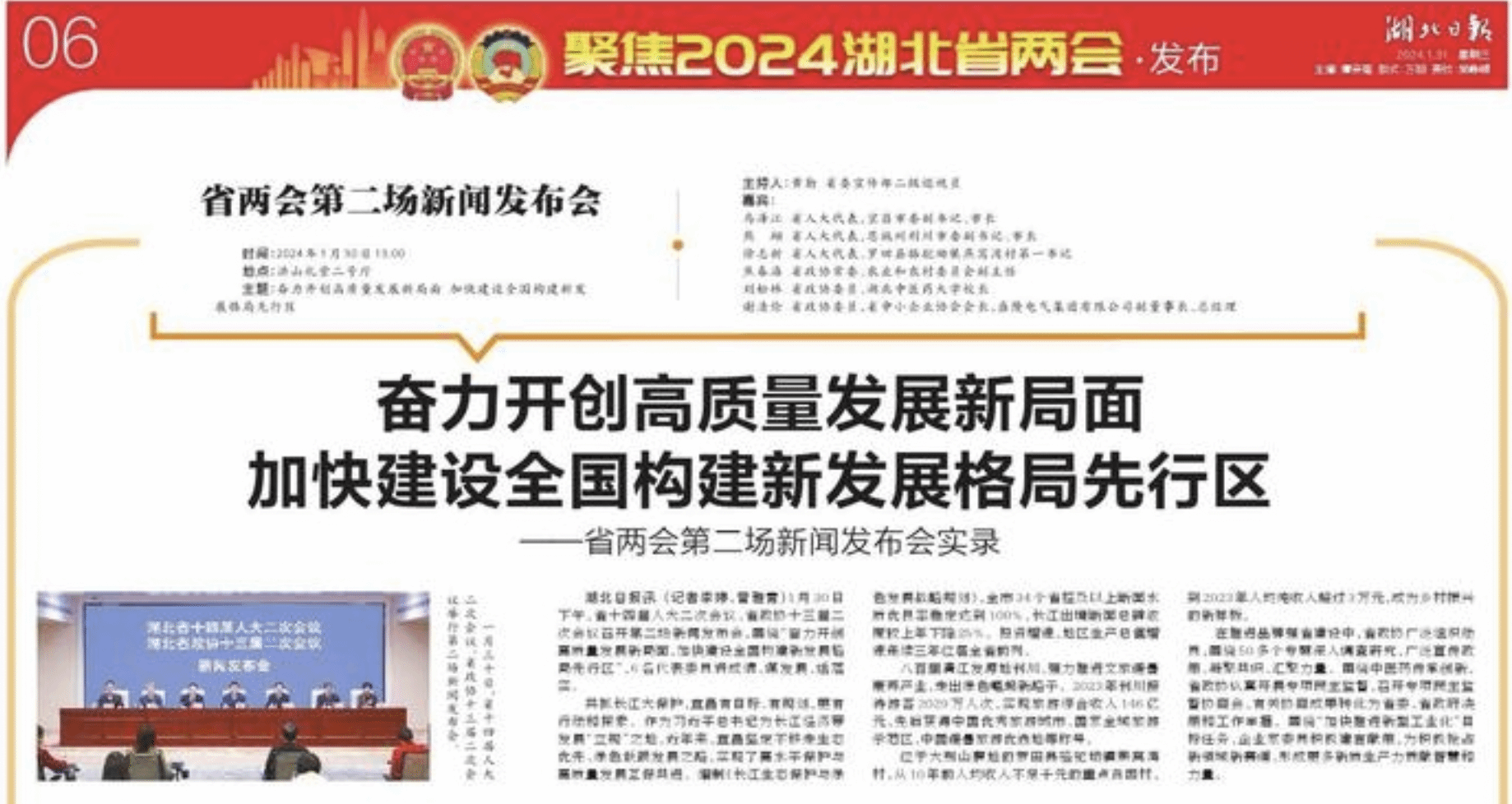 本网讯 1月30日,省十四届人大二次会议、省政协十三届二次会议举行第二场新闻发布会。6名代表委员围绕“奋力开创高质量发展新局面,加快建设全国构建新发展格局先行区”,讲成绩、谋发展、话落实。湖北省政协委员、我校校长刘松林受邀参加新闻发布会,介绍湖北中医药传承创新发展情况并回答记者提问。1月31日,湖北日报6版“聚焦2024湖北省两会·发布”专栏整版刊发省两会第二场新闻发布会图文实录。其中,围绕“中医药”关键词,以“推动转型升级 促进传承创新”为题,对校长刘松林发言内容进行了详细报道,以下为报道全文。