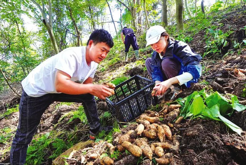 在天麻基地高耸的树林下,一条条标准化的天麻种植垄整齐排列,徐阳晓熟练地扒开松软的土壤,把一个个已经成熟的天麻从地里刨出来。他说,天麻无根无叶,不能进行光合作用,只能通过共生寄生关系从蜜环菌吸收营养,进行生长发育。“别看它很不起眼,平均每亩纯利润可达3万元以上。”