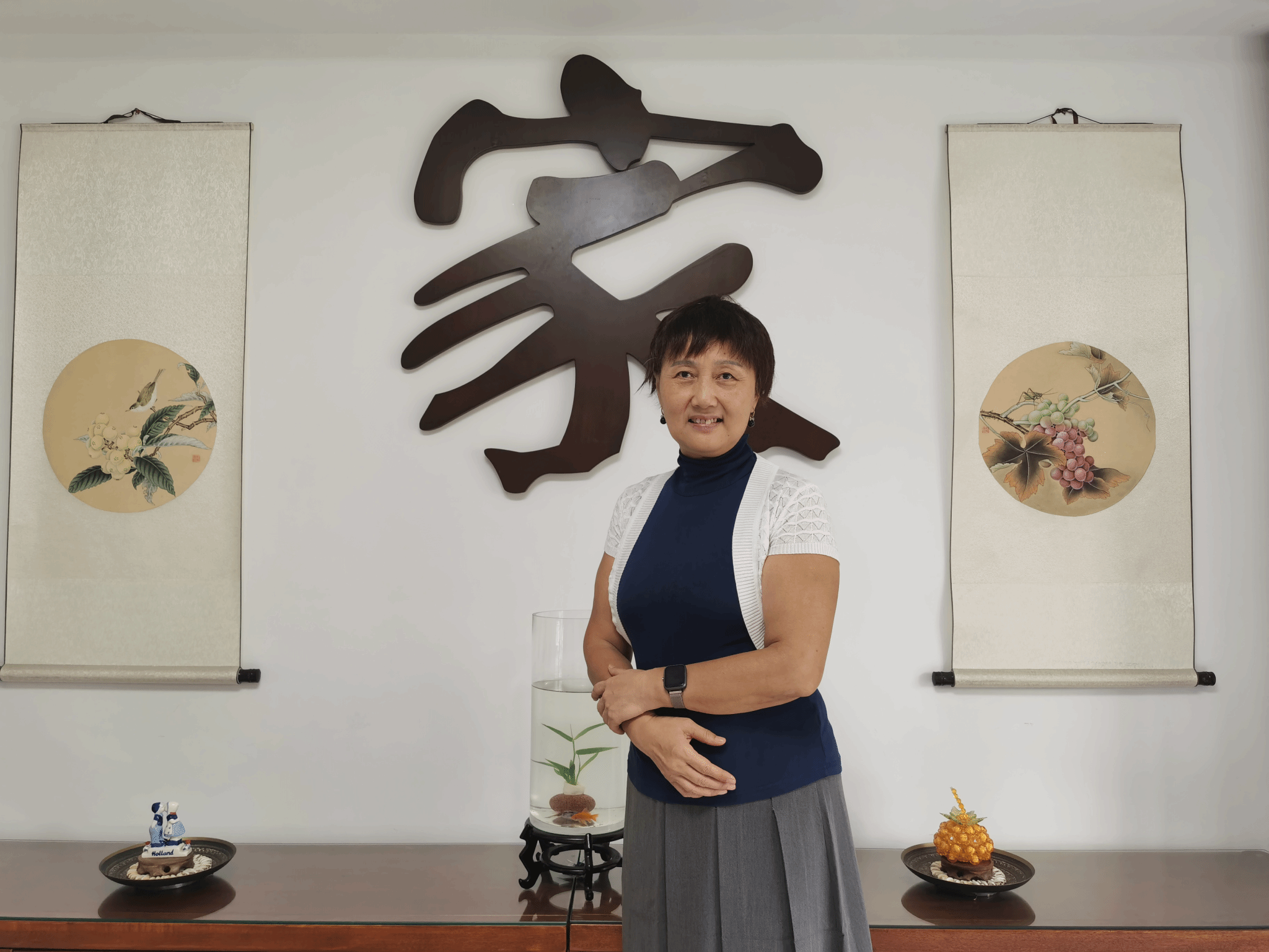 “十一”前夕,记者如约来到了郑晓屏家中进行采访。郑晓屏身材高挑,留着短发,身着蓝色打底上衣搭配白色坎肩,下着一条灰色半身长裙,显得既端庄又大方。