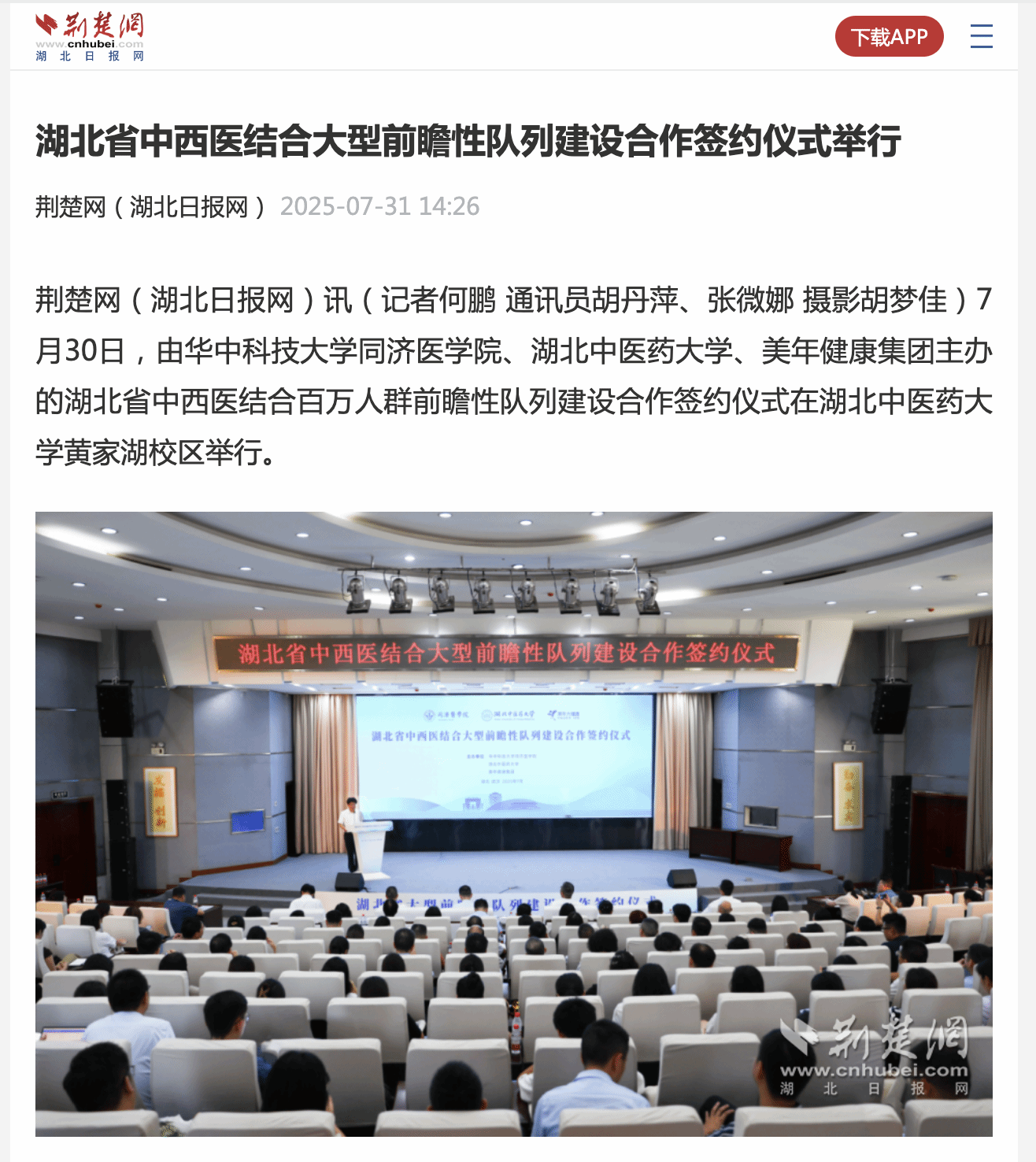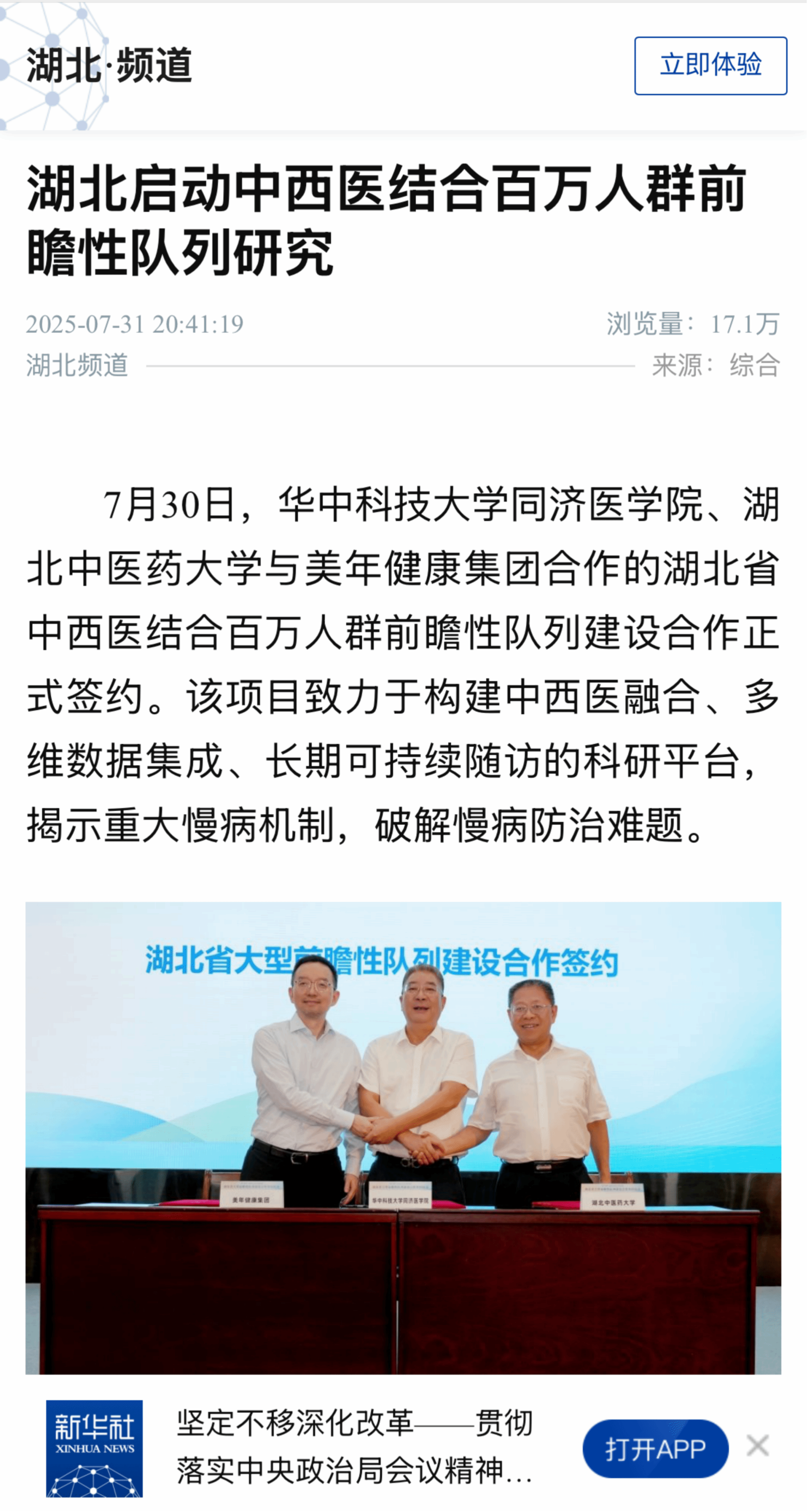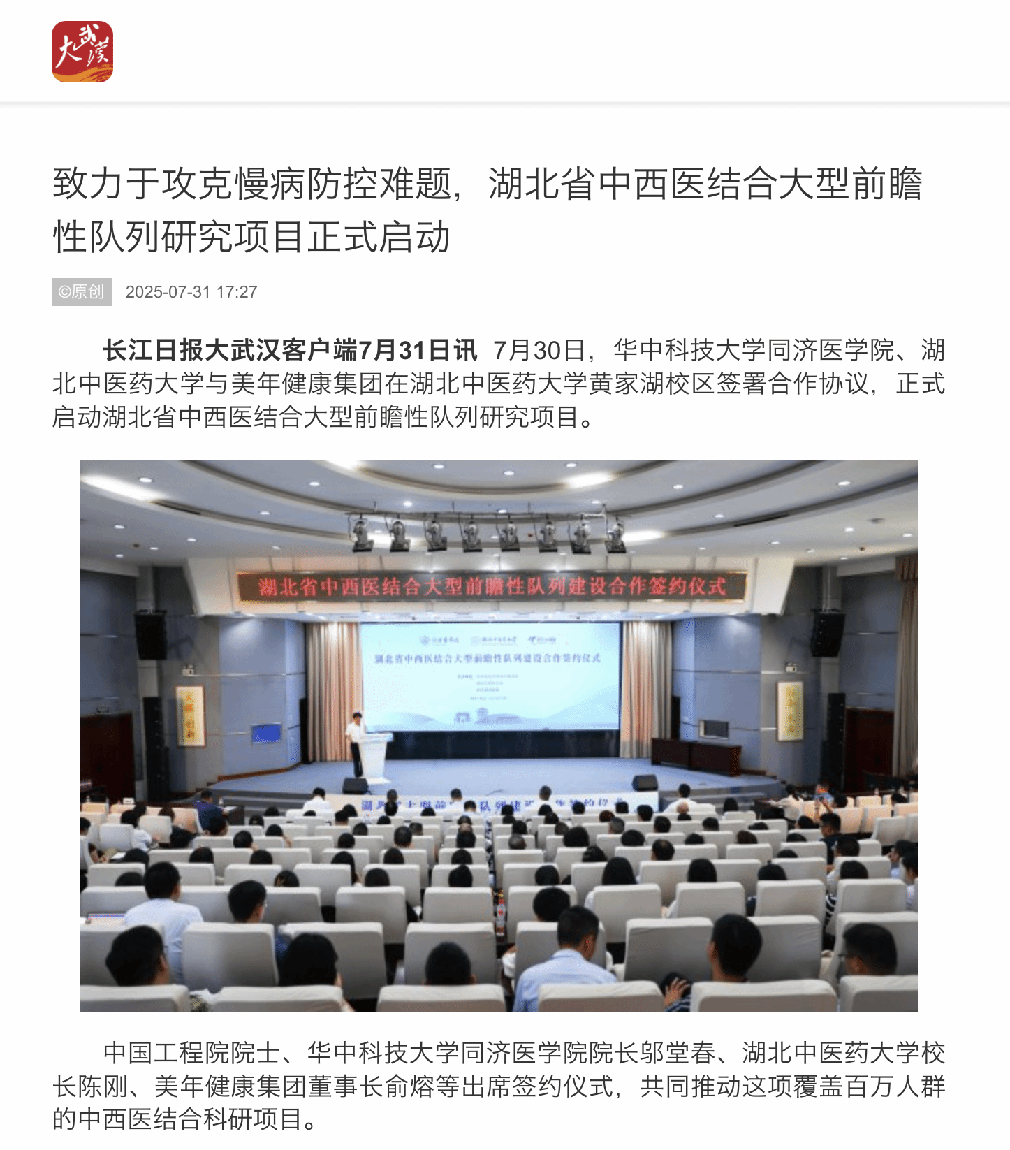 本网讯 7月30日,华中科技大学同济医学院、湖北中医药大学、美年健康集团合作的湖北省中西医结合百万人群前瞻性队列建设合作项目正式签约。项目致力于构建中西医融合、多维数据集成、长期可持续随访的科研平台,揭示重大慢病机制,为服务国家科技创新、提升全民健康水平提供重要支撑。