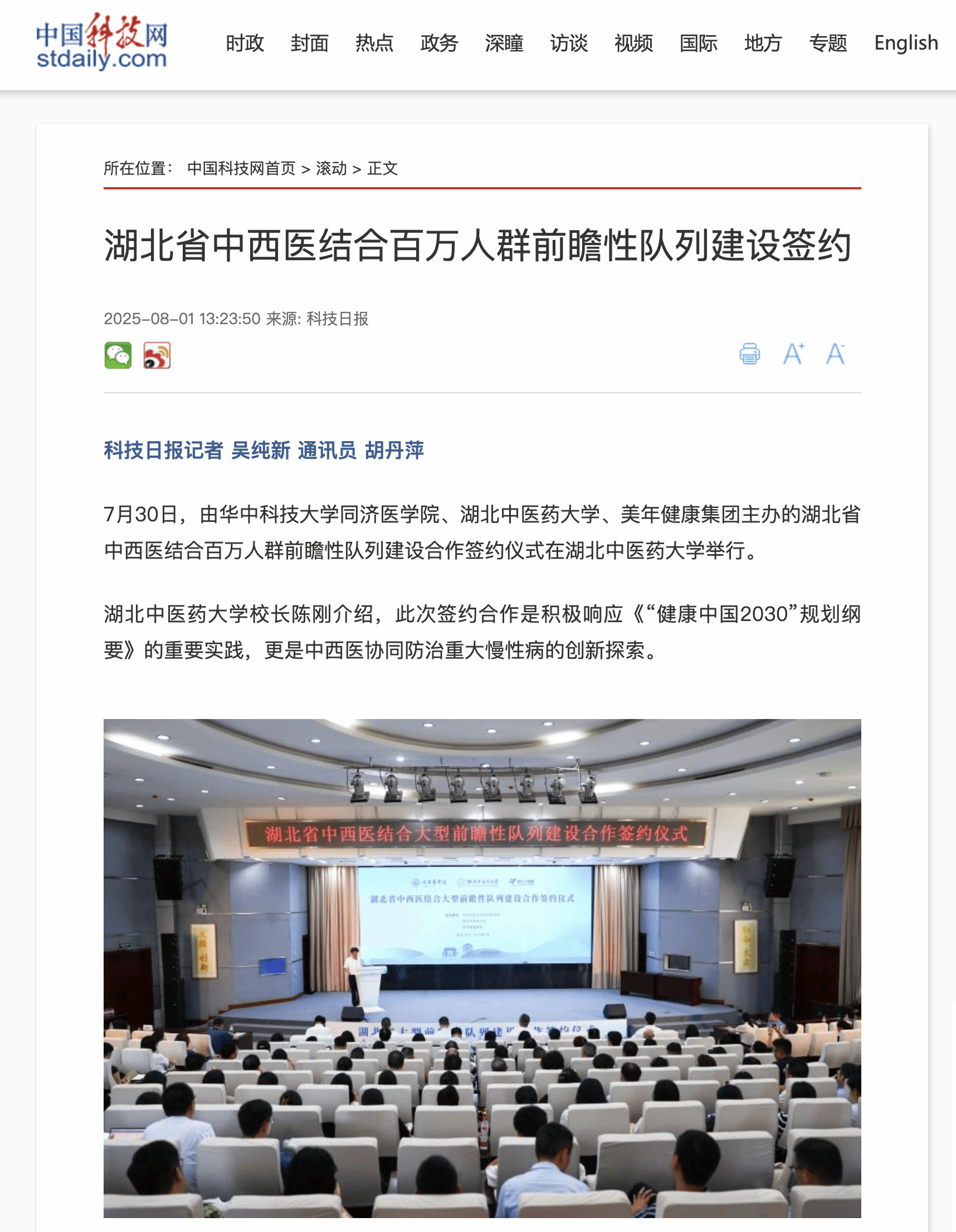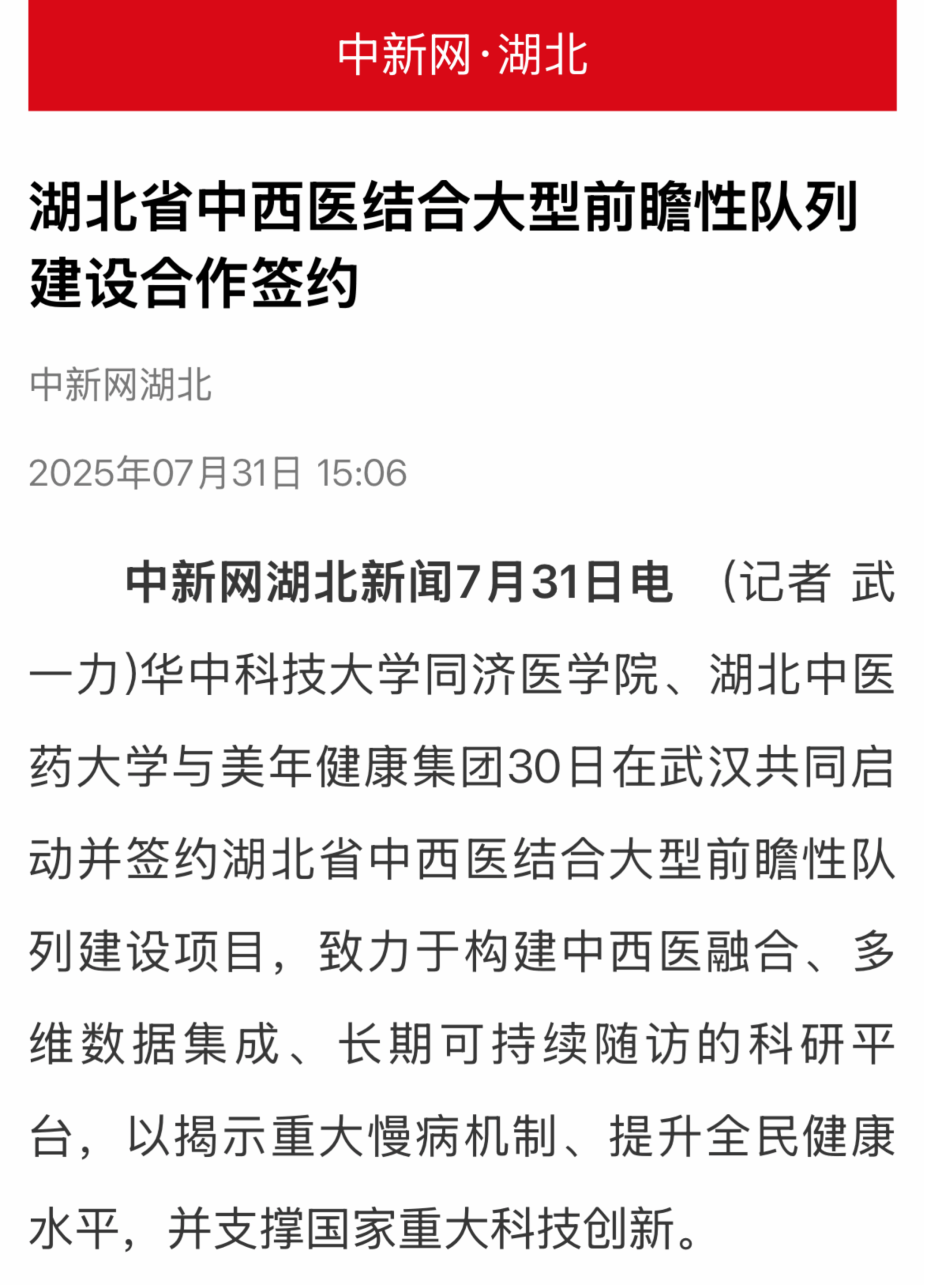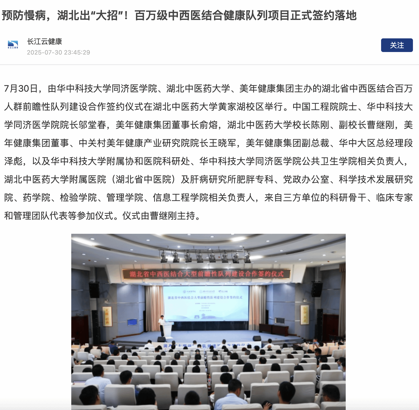 本网讯 7月30日,华中科技大学同济医学院、湖北中医药大学、美年健康集团合作的湖北省中西医结合百万人群前瞻性队列建设合作项目正式签约。项目致力于构建中西医融合、多维数据集成、长期可持续随访的科研平台,揭示重大慢病机制,为服务国家科技创新、提升全民健康水平提供重要支撑。
