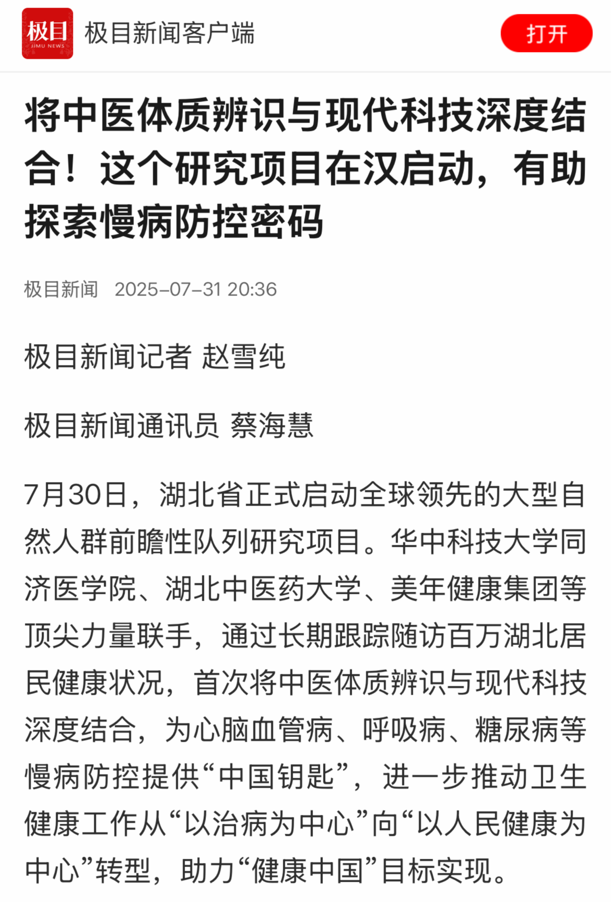 极目新闻:将中医体质辨识与现代科技深度结合!这个研究项目在汉启动,有助于探索慢病防控密码