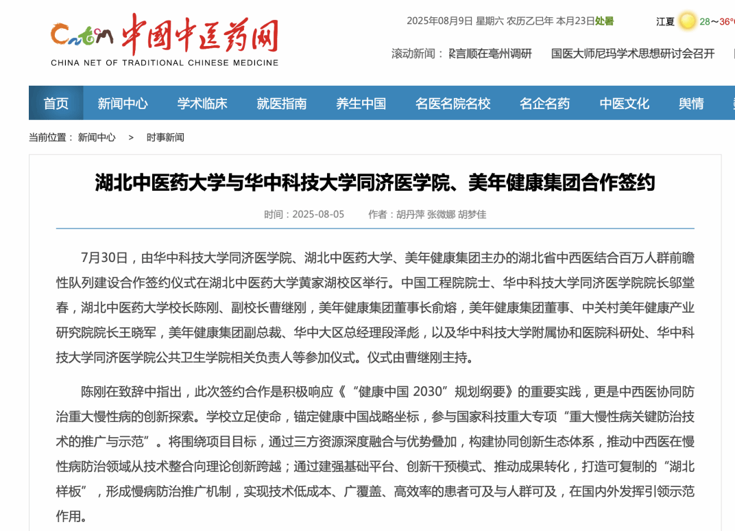 中国中医药网:湖北中医药大学与华中科技大学同济医学院、美年健康集团合作签约