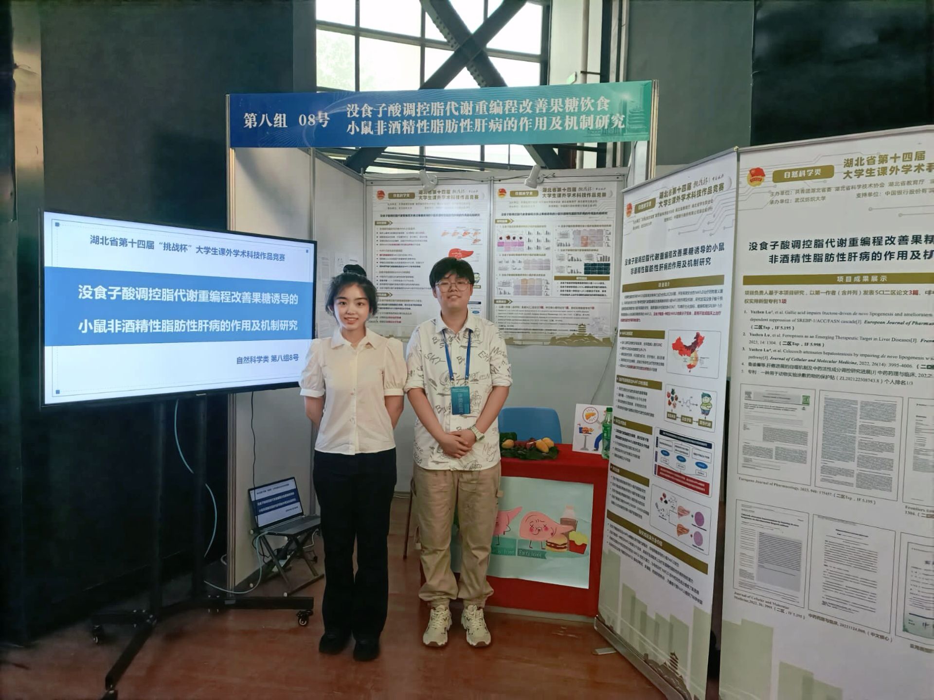 如何布置出吸引评委老师眼球并能充分体现项目内涵的展位?面对这个关键问题,团队成员群策群力,努力在海报设计和展位陈列上彰显中医药特色,展现新意。为此,鲁谕蓁特意向学院中药标本馆老师借取了山茱萸、五倍子等富含没食子酸的中药材,在答辩中展示,获得评委好评。项目《没食子酸调控脂代谢重编程改善果糖饮食小鼠非酒精性脂肪性肝病的作用及机制研究》获2023年“挑战杯”竞赛湖北省特等奖、全国三等奖。