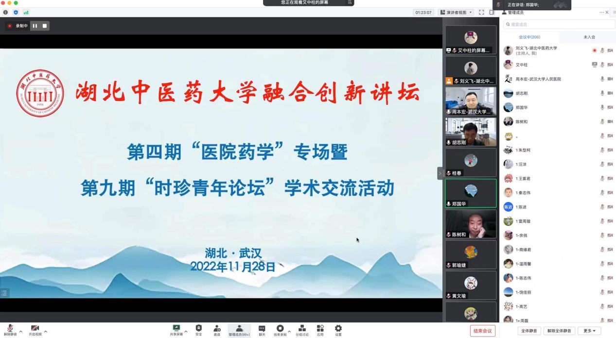 本网讯 11月28日,学校融合创新讲坛第四期“医院药学”专场学术交流报告会暨第九期时珍青年论坛学术交流活动在线上举行。活动特邀武汉大学人民医院周本宏主任药师、附属湖北省中医院陈树和主任药师、武汉市第一医院胡松主任药师、武汉市中医医院张义生主任药师、中国药科大学贺建华特聘副研究员作学术报告,药学院领导班子成员以及师生代表参加活动。药学院行政负责人、相关负责人、卢山副教授分别主持活动。