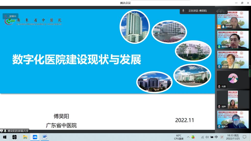本网讯 11月25日,信息工程学院邀请广东省中医院信息管理办公室傅昊阳主任作题为“数字化医院建设现状与发展”的线上讲座。讲座由信息工程学院负责人主持。学院百余名师生聆听。