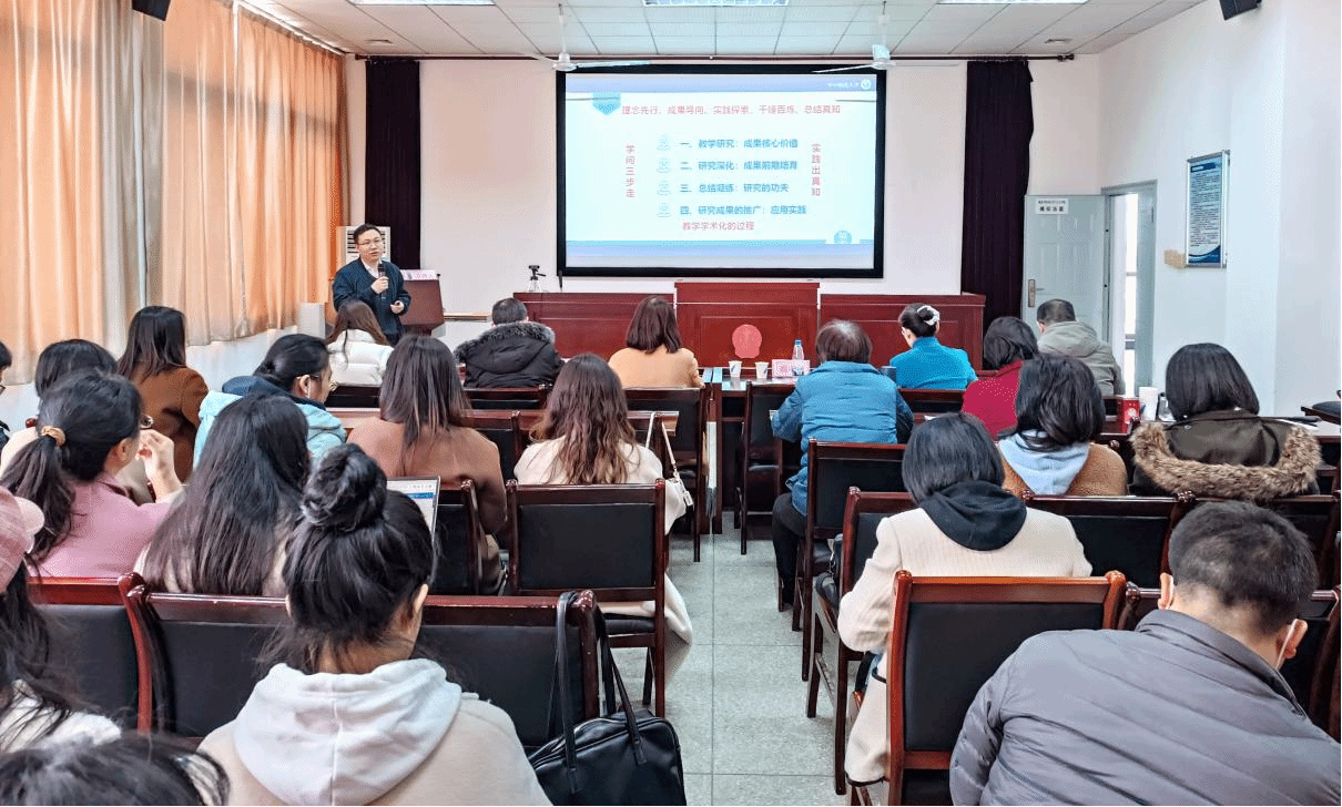 胡中波以“研究融教学 实践出真知——教学研究与教学成果的积累”为题,从“教学研究:成果核心价值”“研究深化:成果前期培育”“总结凝练:研究的功夫”“研究成果的推广:应用实践”四个方面进行了阐述,重点讲解了教学成果奖的内涵、设置、评审体系以及教学成果的孵化、切入视角、凝练方法等,并通过案例分享的形式展示如何“将功夫做在平时”。胡中波强调,要以项目化的管理做好教学改革研究,凝练出具有特色亮点的教学成果,进而产出高质量的实践研究成果。整场讲座主题鲜明、内容丰富、启发性强,为教师开展教学研究、申报教研项目理顺了思路、提供了有益指导。
