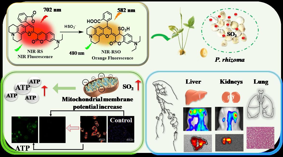 本网讯 近日,我校中药生态农业团队刘大会教授、冯书敏副教授联合华中师范大学冯国强教授,成功开发出一种名为NIR-RS的近红外比率荧光探针,为定量检测中药中SO2残留量及活体生物成像提供了全新视角和强大工具。相关研究成果以“A NIR and ratiometric fluorescent probe for quantitative detection of SO2 derivatives in Chinese medicinal materials and bioimaging in vivo”为题发表于Chinese Chemical Letters(中科院1区Top,JCR分区Q1,IF:9.4),我校药学院研究生武美彤和本科生吴珂为第一作者,冯书敏副教授、刘大会教授和冯国强教授为共同通讯作者。