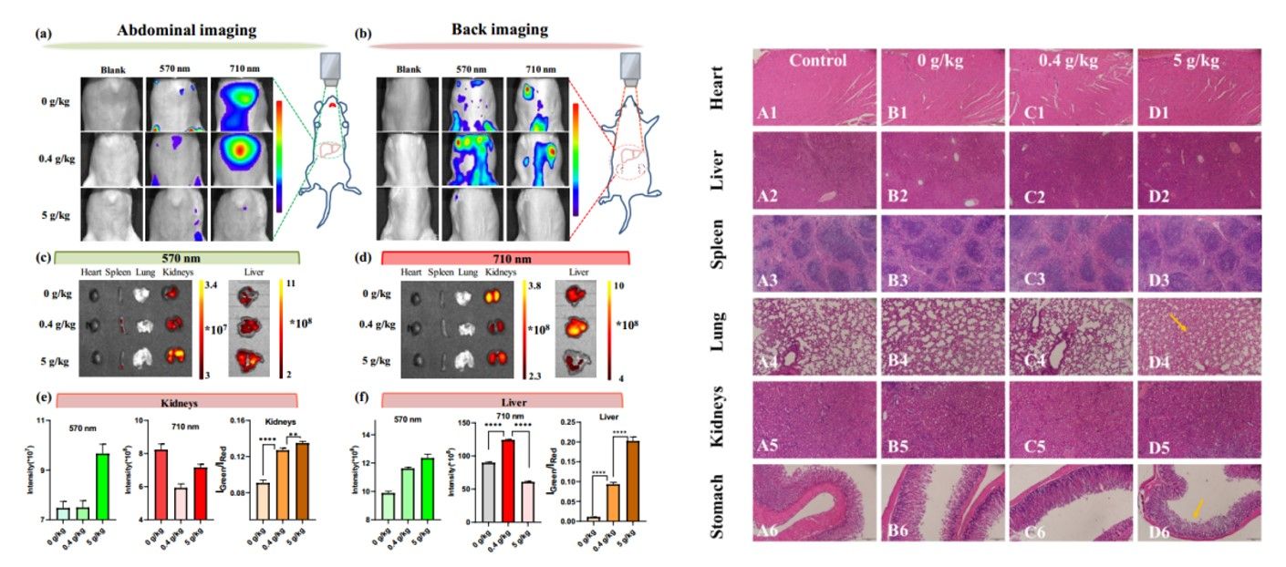 研究还进一步实验证实了NIR-RS可以动态监测焦亚硫酸钠处理的半夏样品在体内的代谢途径,并探究高浓度SO2对生物体器官的损伤。实验前,使用焦亚硫酸钠处理的半夏样品灌胃处理小鼠数日,开始实验后将NIR-RS静脉注射至小鼠体内开始成像,此时NIR-RS在肝脏和肾脏710nm的荧光信号增强。当半夏中SO2含量值超过药典规定150mg/kg时,会使得探针在肝脏中高浓度异常聚集,这可能是由于肝脏代谢能力受到了影响。同时,高SO2残留半夏样品会导致小鼠肝脏和肾脏中SO2水平升高,该工作明确了半夏样品SO2残留量的代谢路径。通过毒理学实验观察,高浓度SO2可能引发小鼠机体肺纤维化和胃黏膜损伤,为研究SO2残留半夏的病理和生理毒性开辟了新途径。