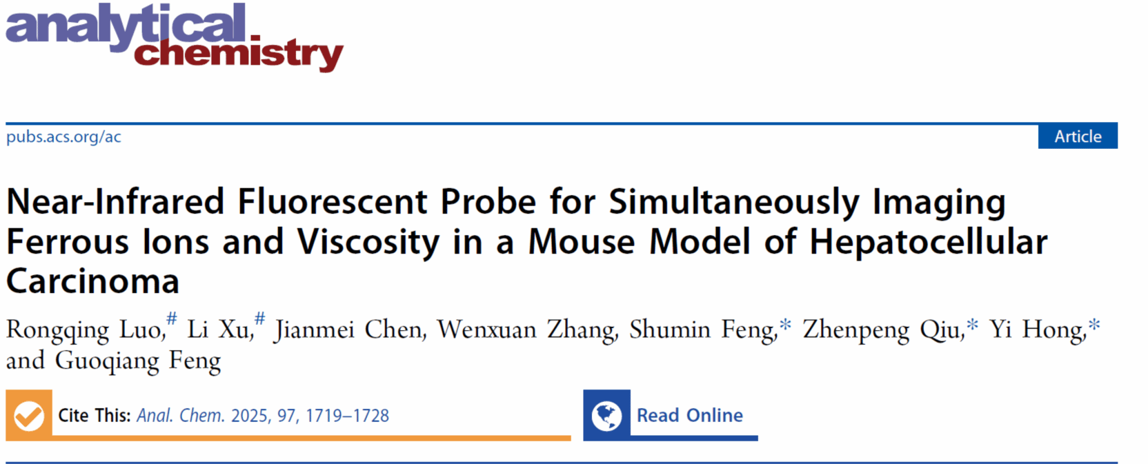 本网讯 近日,我校药学院徐黎副教授、冯书敏副教授研究论文“Near-Infrared Fluorescent Probe for Simultaneous Imaging Ferrous Ions and Viscosity in a Mouse Model of Hepatocellular Carcinoma”发表于国际化学权威期刊Analytical Chemistry(中科院1区Top,IF:6.8)。药学院研究生罗荣清和徐黎副教授为第一作者,药学院冯书敏副教授、洪怡教授和邱振鹏教授为共同通讯作者。