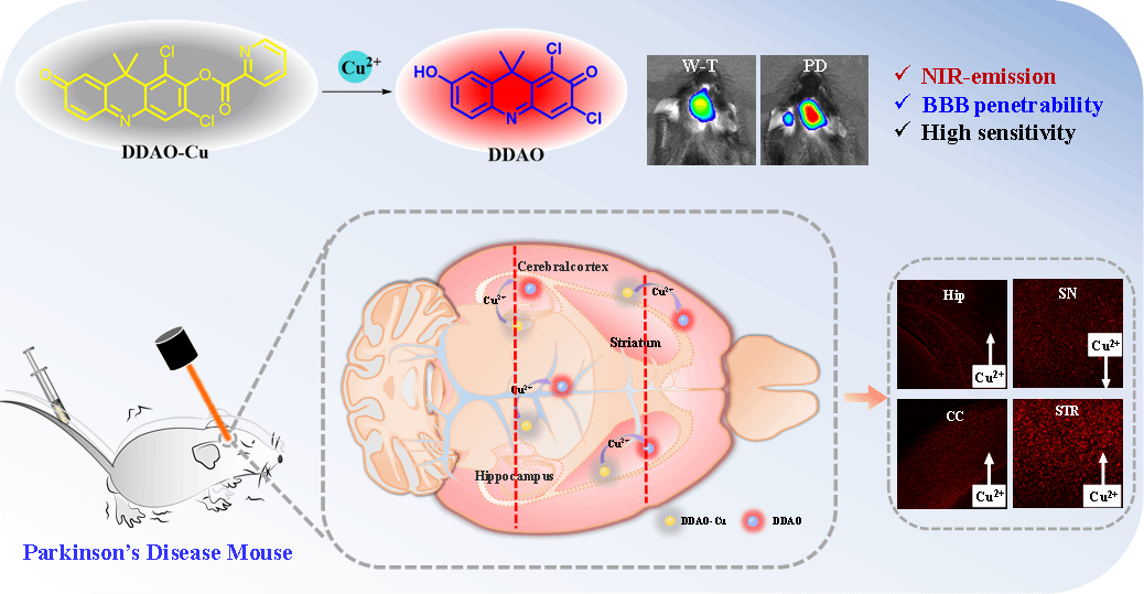 在这项工作研究中,设计开发了一种特异性检测铜离子的近红外荧光探针DDAO-Cu。作者利用该探针揭示了鱼藤酮诱导的细胞和斑马鱼PD模型中Cu²⁺含量升高,且探针能穿过血脑屏障,对帕金森病模型小鼠大脑中的Cu²⁺进行成像。这项研究通过系统的成像帕金森模型中的Cu²⁺,为揭示帕金森病与Cu²⁺相关的潜在病理机制提供了重要工具。