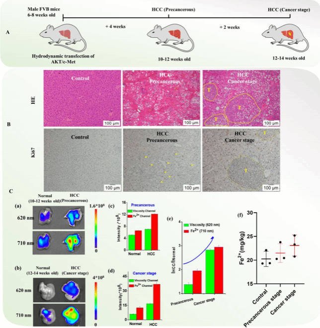 在这项研究中,作者开发了一种双响应近红外探针QM-FV,可以通过两个独立的荧光信号同时监测HCC中的Fe²⁺和粘度。此外,QM-FV还可以区分正常细胞和癌症细胞。值得注意的是,为更好地了解Fe²⁺如何破坏HCC细胞内的粘度,QM-FV用于同时监测铁下垂和顺铂诱导的凋亡过程中的Fe²⁺和粘度。最后,使用QM-FV,研究发现在HCC的癌前阶段,Fe²⁺水平和粘度升高,随着疾病的进展,两者都在逐渐增加。这项工作为研究HCC的粘度和Fe²⁺相关病理过程提供了一种新的有价值的工具。
