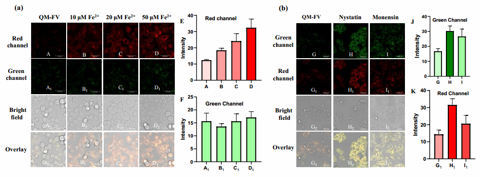 体外光学测试表明该探针能快速响应Fe²⁺(150s),显示出高度选择性地开启近红外荧光(在740nm处增强约30倍),具有高灵敏度(LOD=25nm)和显著的斯托克斯位移(290nm)。作者对QM-FV成像细胞内的Fe²⁺和粘度进行了探究,在QM-FV组中,红色和绿色通道都表现出微弱的荧光,随着外源性Fe²⁺浓度的增加,HepG2细胞中红色通道的荧光明显上升,表明QM-FV可以成像细胞中的Fe²⁺。使用莫能菌素和制霉菌素刺激HCC细胞时,绿色和红色通道中均显示出明显的荧光增强。这些结果表明,QM-FV是追踪Fe²⁺水平和粘度变化的有效探针。