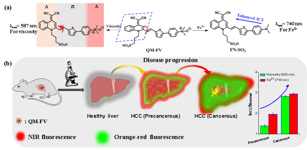 原发性肝癌 (HCC)是一种发生率和死亡率都很高的恶性肿瘤,大多数HCC患者的生存期普遍较短,主要原因是诊断期较晚,因此开发新的诊断方法很有必要。铁元素是生理过程中必不可少的元素,但亚铁离子(Fe²⁺)水平异常会导致细胞内活性氧(ROS)增加,扰乱细胞内粘度,并导致肝细胞癌(HCC)的发生。同时可视化Fe²⁺和细胞内粘度对理解HCC的详细病理生理过程至关重要。该工作报告了第一例能够同时监测Fe²⁺和粘度的双响应探针QM-FV。