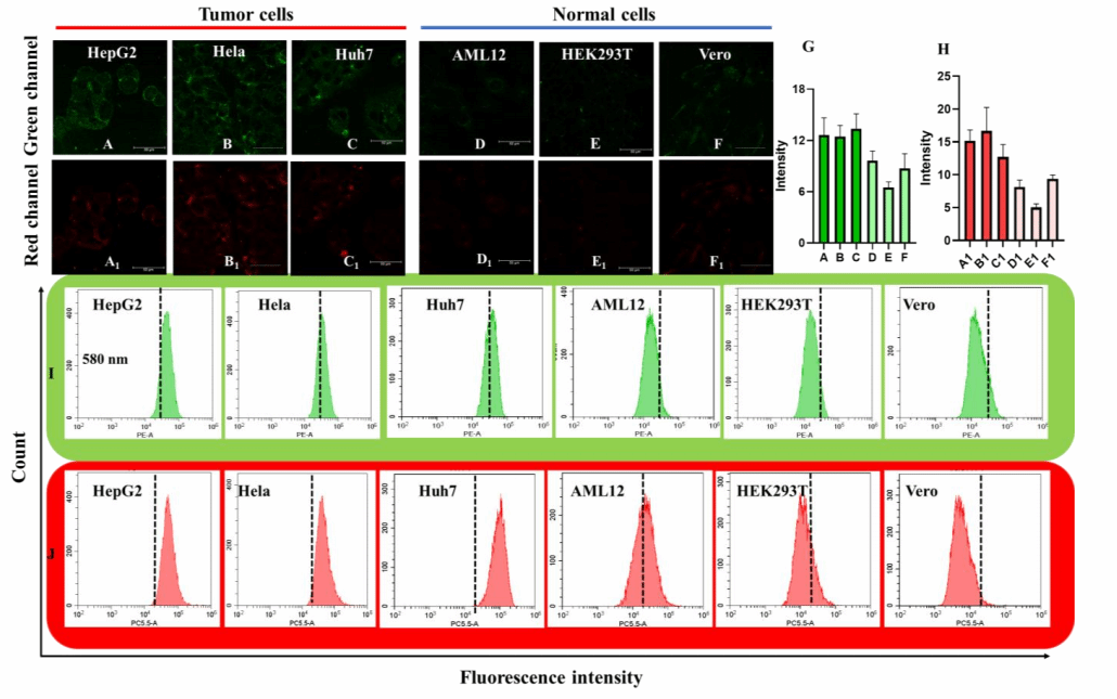 接着,作者进一步探索了QM-FV的成像能力,用QM-FV对各种细胞进行染色,包括肝细胞癌细胞(HepG2,Huh7)、宫颈癌细胞(Hela)和正常肝细胞(AML12)、肾细胞(HEK293T,Vero)。值得注意的是,作者在所有癌症的红色和绿色通道中都观察到了明亮的荧光,而正常细胞显示弱荧光。并且对QM-FV染色的细胞进行流式细胞术分析,结果表明QM-FV有效地成像了HepG2和Hela细胞。这支持了细胞成像结果,并进一步证实了QM-FV对HCC细胞内粘度和Fe²⁺的成像能力。