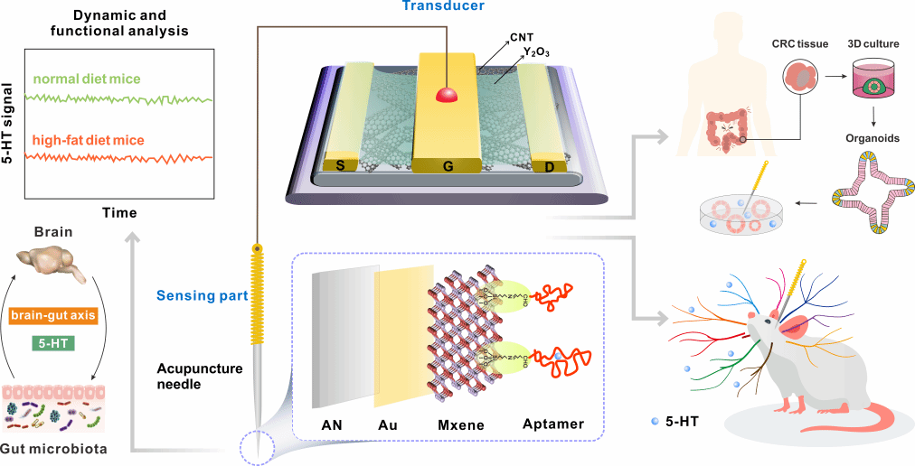 该研究首次基于针灸针型延长栅可拆卸设计,构建了一种新型晶体管神经探针,解决了传统晶体管传感器在活体应用中面临的加工工艺复杂、稳定性差等技术瓶颈。针灸针具有尺寸小、坚韧、无毒、成本低等优点,作为体内检测的传感装置可发挥独特性能。结合MXene增强的高性能传感界面,实现了对人源类器官及活体鼠脑中5羟色胺的实时动态监测,并揭示了高脂饮食通过“脑-肠轴”影响肠道菌群及脑内5羟色胺水平、导致抑郁样行为的潜在分子机制。