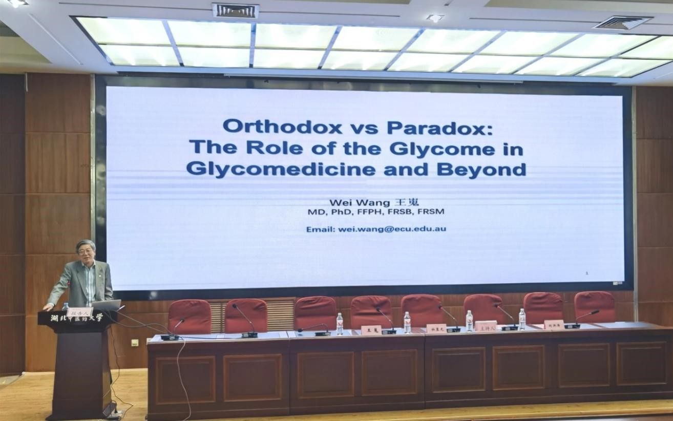 本网讯 4月16日,英国皇家内科医生学会公共卫生学院院士(FFPH)、英国皇家医学院会士(FRSM)、英国皇家生物学会会士(FRSB),澳大利亚Edith Cowan大学副校长王嵬教授做客我校第十八届濒湖论坛,为师生作题为“Orthodox vs Paradox: The Role of the Glycome in Glycomedicine and Beyond”的学术报告。中药资源与中药复方教育部重点实验室主任杜昱光教授、副主任刘洪涛教授及基础医学院师生代表百余人参加报告会。报告会由基础医学院行政负责人主持。