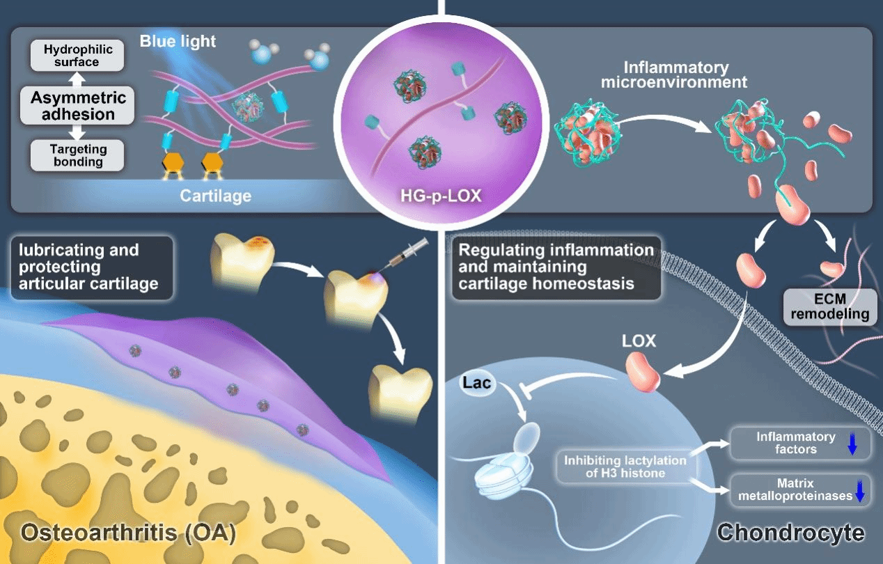 该研究不仅揭示了LOX在OA中的新机制,也首次提出通过调控乳酸代谢-表观遗传轴干预骨关节炎的新策略。HG-p-LOX系统兼具生物相容性好、组织穿透性强、缓释性能优等优势,具有良好的临床转化前景。