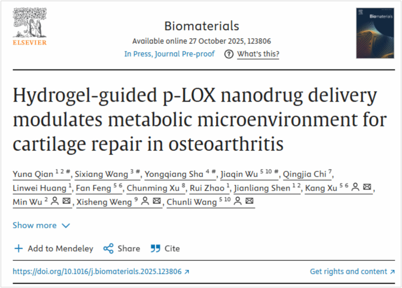 本网讯 近日,我校王春莉/许康课题组联合温州医科大学钱宇娜等团队,在国际生物材料顶尖期刊《Biomaterials》(IF=12.9,中科院一区top期刊)上发表题为《Hydrogel-guided p-LOX nanodrug delivery modulates metabolic microenvironment for cartilage repair in osteoarthritis》的研究论文。该研究创新性地构建了一种基于赖氨酰氧化酶(LOX)的纳米药物递送系统,为骨关节炎(OA)治疗提供了新的策略和理论依据。