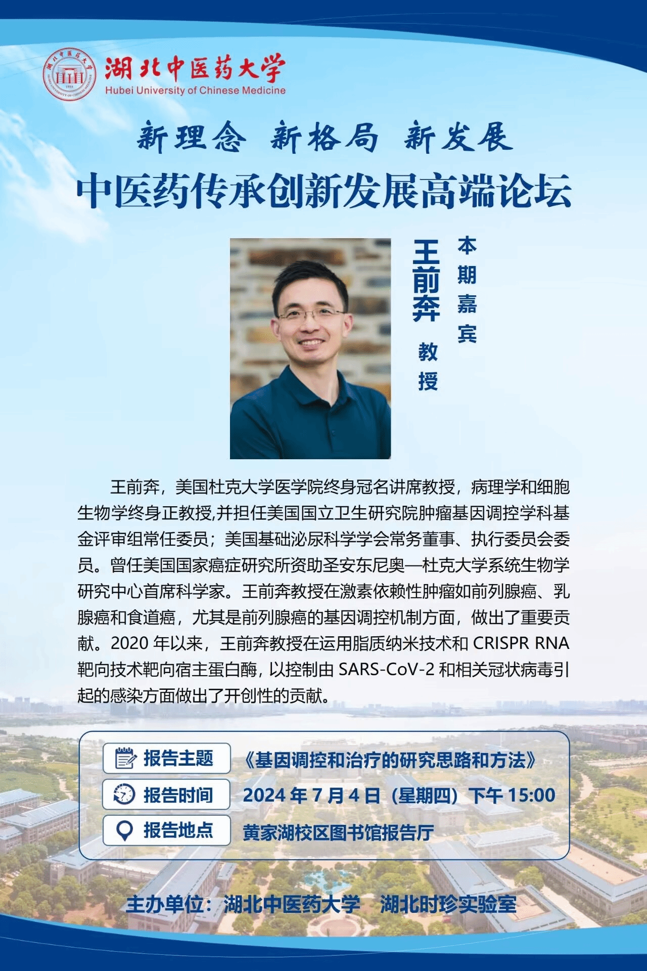 王前奔,美国杜克大学医学院终身冠名讲席教授,病理学和细胞生物学终身正教授,并担任美国国立卫生研究院肿瘤基因调控学科基金评审组常任委员;美国基础泌尿科学学会常务董事、执行委员会委员。曾任美国国家癌症研究所资助圣安东尼奥—杜克大学系统生物学研究中心首席科学家。王前奔教授在激素依赖性肿瘤如前列腺癌、乳腺癌和食道癌,尤其是前列腺癌的基因调控机制方面,做出了重要贡献。2020年以来,王前奔教授在运用脂质纳米技术和CRISPR RNA靶向技术靶向宿主蛋白酶,以控制由SARS-CoV-2和相关冠状病毒引起的感染方面做出了开创性的贡献。