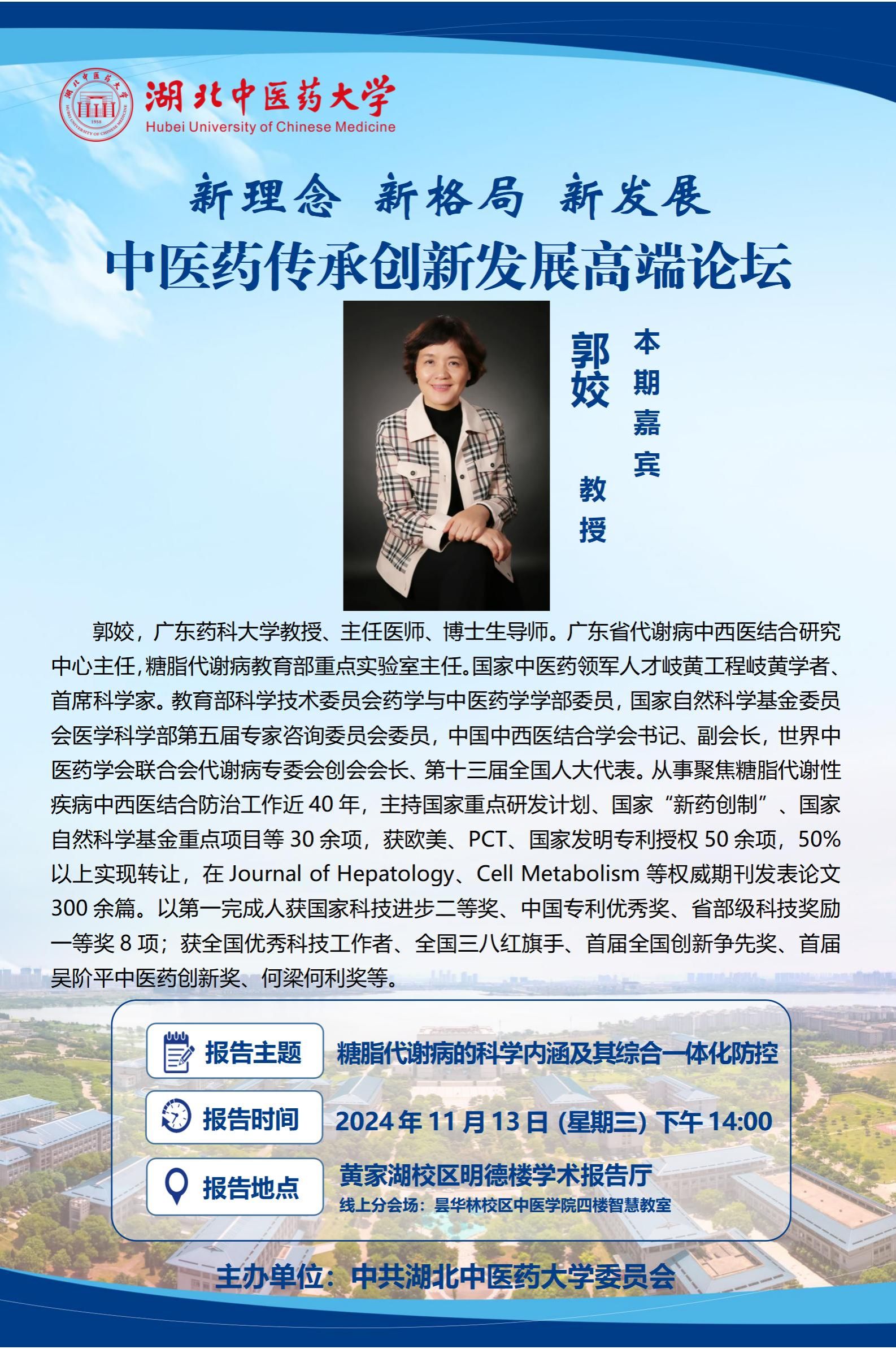 主讲人简介:郭姣,广东药科大学教授、主任医师、博士生导师。广东省代谢病中西医结合研究中心主任,糖脂代谢病教育部重点实验室主任。国家中医药领军人才岐黄工程岐黄学者、首席科学家。教育部科学技术委员会药学与中医药学学部委员,国家自然科学基金委员会医学科学部第五届专家咨询委员会委员,中国中西医结合学会书记、副会长,世界中医药学会联合会代谢病专委会创会会长、第十三届全国人大代表。从事聚焦糖脂代谢性疾病中西医结合防治工作近40年,主持国家重点研发计划、国家“新药创制”、国家自然科学基金重点项目等30余项,获欧美、PCT、国家发明专利授权50余项,50%以上实现转让,在Journal of HepatologyCell Metabolism等权威期刊发表论文300余篇。以第一完成人获国家科技进步二等奖、中国专利优秀奖、省部级科技奖励一等奖8项;获全国优秀科技工作者、全国三八红旗手、首届全国创新争先奖、首届吴阶平中医药创新奖、何梁何利奖等。