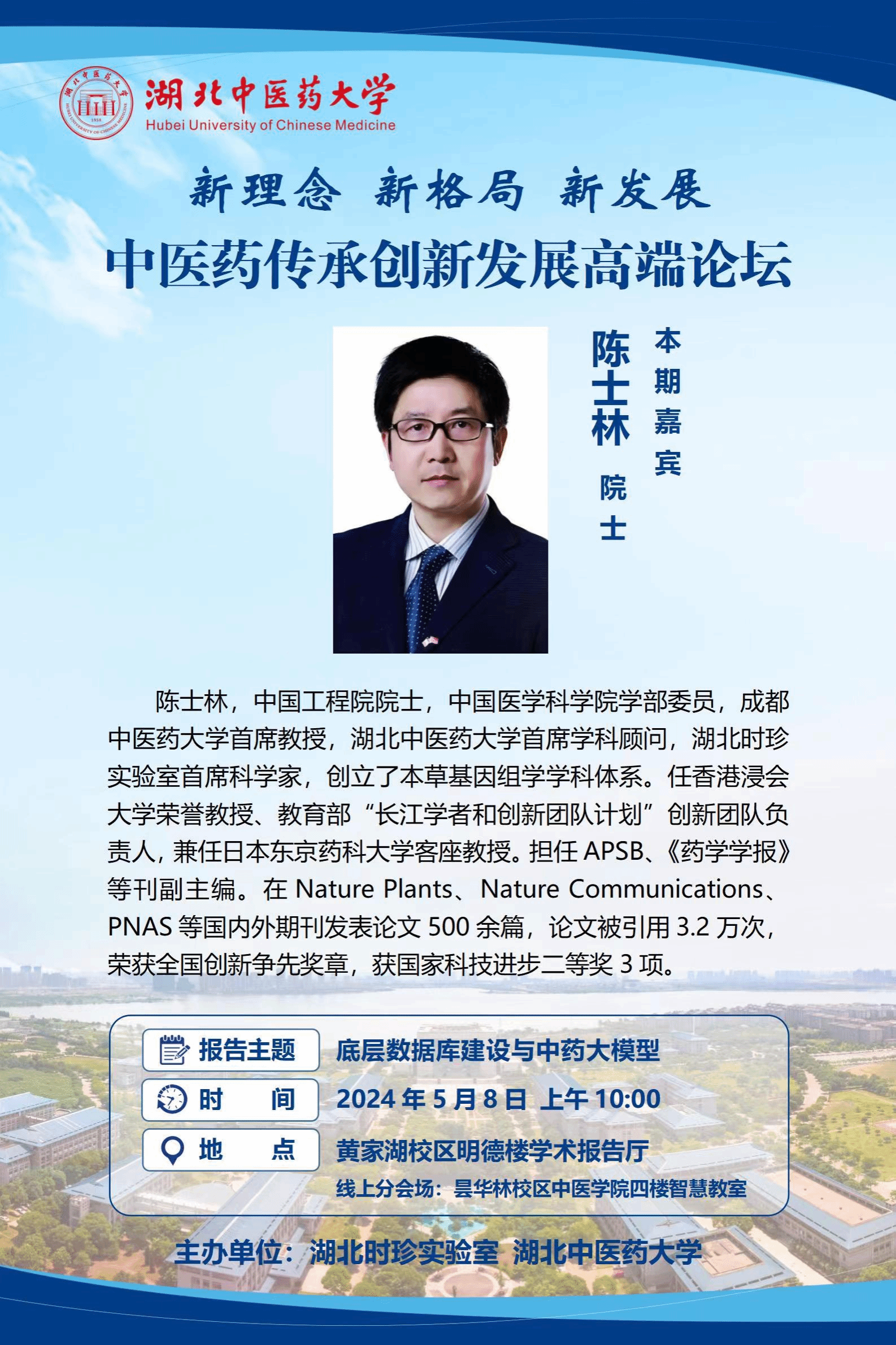 陈士林 中国工程院院士,中国医学科学院学部委员,成都中医药大学首席教授,湖北中医药大学首席学科顾问,湖北时珍实验室首席科学家,创立了本草基因组学学科体系。任香港浸会大学荣誉教授、教育部“长江学者和创新团队计划”创新团队负责人,兼任日本东京药科大学客座教授。担任APSB、《药学学报》等刊副主编。在Nature Plants,Nature Communications,PNAS等国内外期刊发表论文500余篇,论文被引用3.2万次,荣获全国创新争先奖章,获国家科技进步二等奖3项。