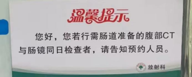2、结算时在自助机上输出的检查预约凭条上予以提示:①若同时有做全腹CT平扫、全腹CT平扫+增强、下腹CT平扫、下腹CT平扫+增强检查,请主动告知前台预约工作人员。②若同时有做肠镜检查,请主动告知前台预约工作人员。