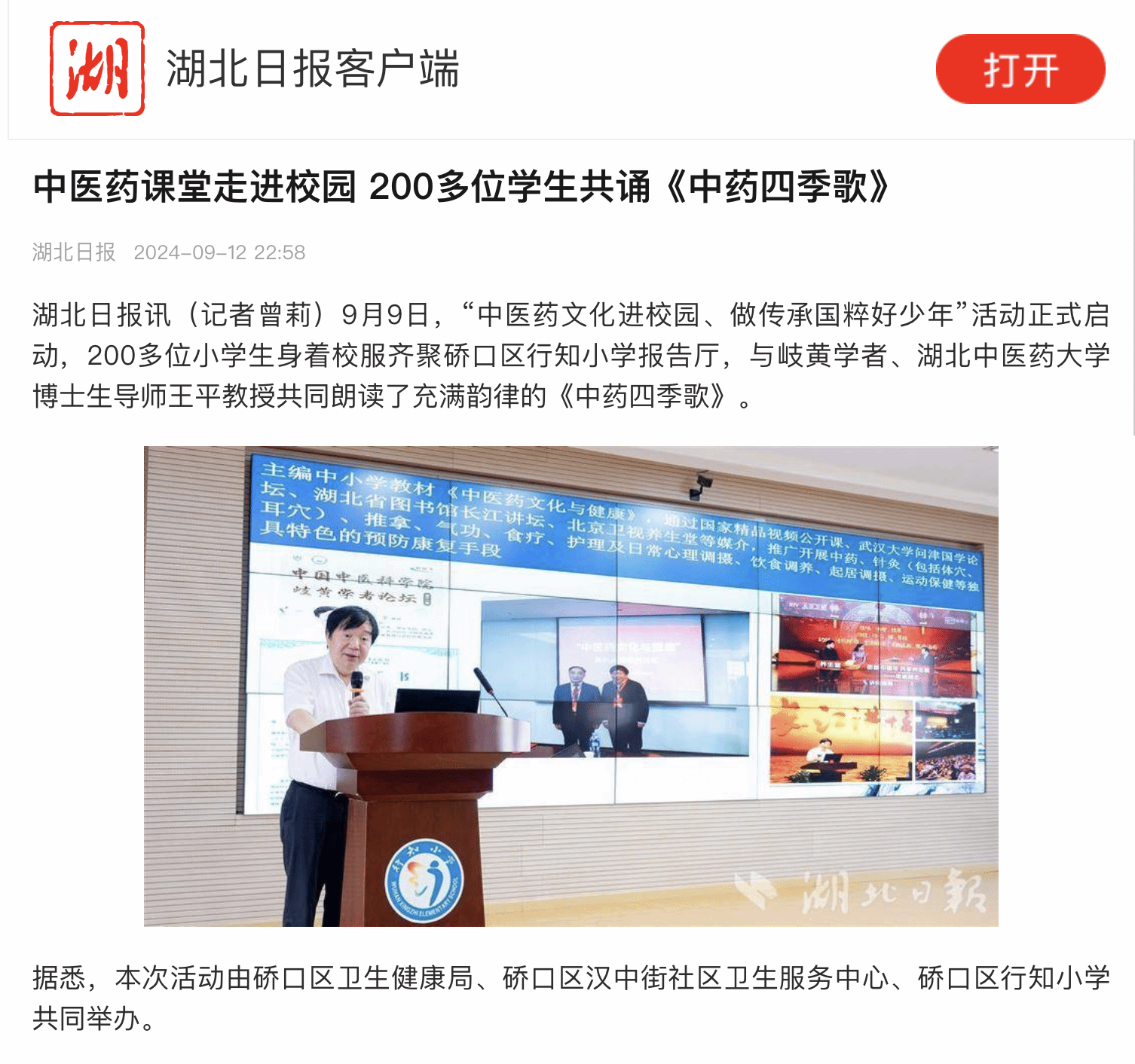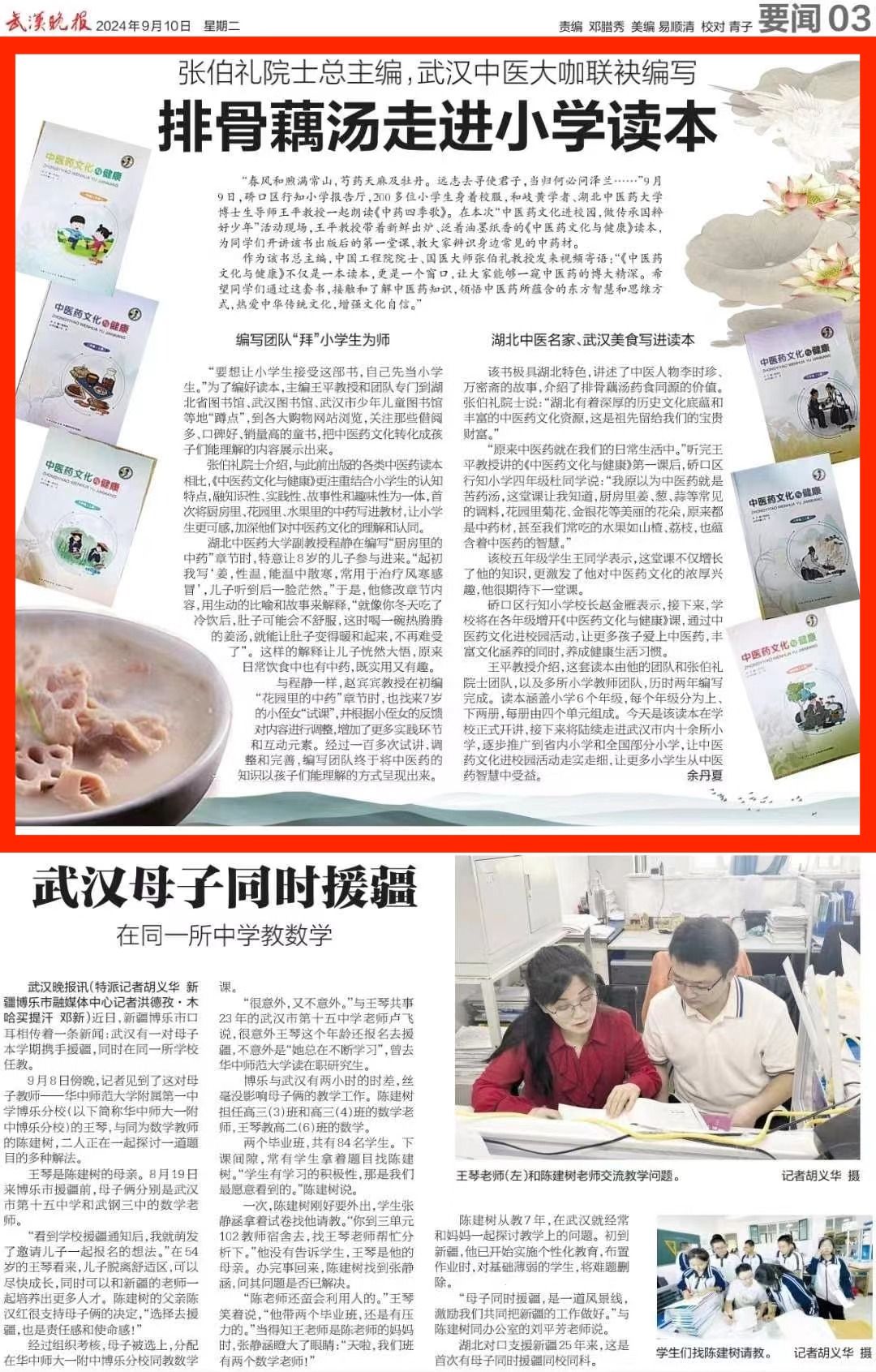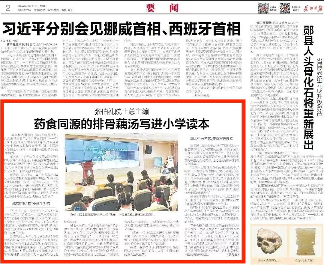 湖北日报、长江日报要闻版、武汉晚报关注版分别以《中医药课堂走进校园 200多位学生共读<中药四季歌>》《张伯礼院士总主编 药食同源的排骨藕汤写进小学读本》《张伯礼院士总主编 武汉中医大咖联袂编写 药食同源的排骨藕汤写进小学读本》为题,对本次活动进行了图文报道。