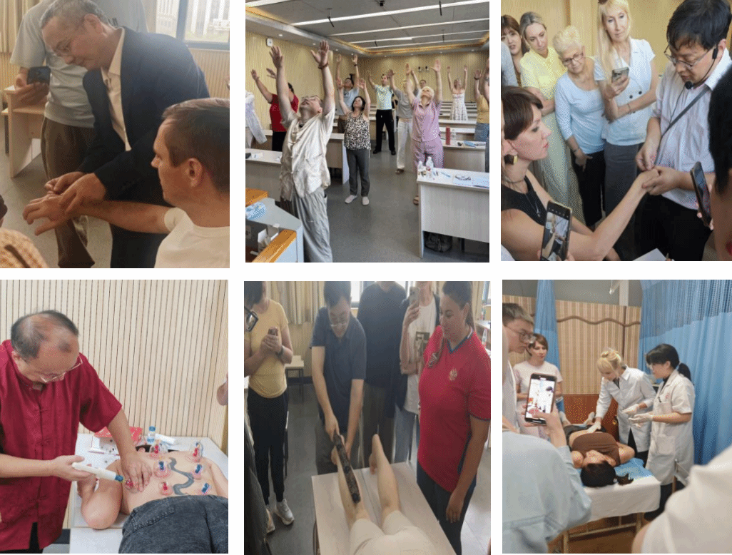 本次研学班聚焦中医针灸、推拿、骨伤、埋线、整脊、中药敷贴、中医全息疗法等深受俄罗斯民众欢迎的中医药特色诊疗技术,安排了一系列中医经典疗法课程及临床跟诊等实践活动。我校针灸骨伤学院专家团队为俄罗斯学员讲授了中医针灸同源点疗法、中医全息疗法治疗常见疾病,以及中药敷贴治疗呼吸系统疾病等临床知识。武汉市中医医院、黄冈市中医医院专家开展了《艾灸的临床运用原理与常见疾病治疗》《“汉派松筋正骨”非遗技术》《液波治疗及通天针治疗代谢类疾病与常见疼痛》等专题讲座。在学校附属医院,学员们参观了医院文化长廊、现代化中药房、中医传承工作室,观摩中医临床诊疗技术,品尝应季中药养生茶,观摩中医功法表演,并在医院针灸科和推拿科进行临床跟诊学习。