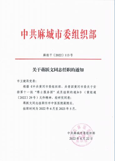 工作室负责人蒋跃文副教授作为湖北省第十一批“博士服务团”成员,挂职任麻城市中医医院副院长,时间从2022年6月至2023年5月。