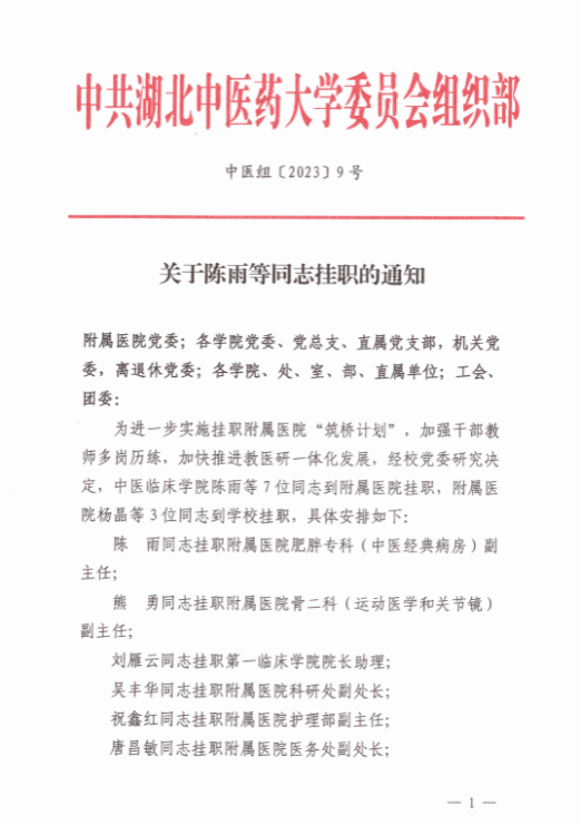 经学校党委研究决定,工作室陈雨教授2023年5月18日起挂职湖北中医药大学附属医院肥胖科(中医经典病房)副主任,为期6个月。