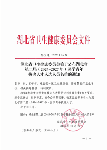 2023年10月27日,工作室成员陈雨、赵开政成功入选湖北省第二届(2024-2027)医学青年拔尖人才入选名单。