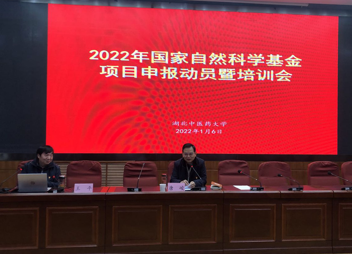 本网讯 为提升学校国家自然科学基金项目申报质量及资助率,1月6日,学校在黄家湖校区图书馆学术报告厅召开2022年国家自然科学基金项目申报动员暨培训会。会议以线上线下相结合的方式进行。校党委书记唐峻,副校长王平,附属湖北省中医院各科室主任、骨干人员,各学院党政负责人、分管科研工作副院长、项目申请人等参加会议。会议由王平主持。