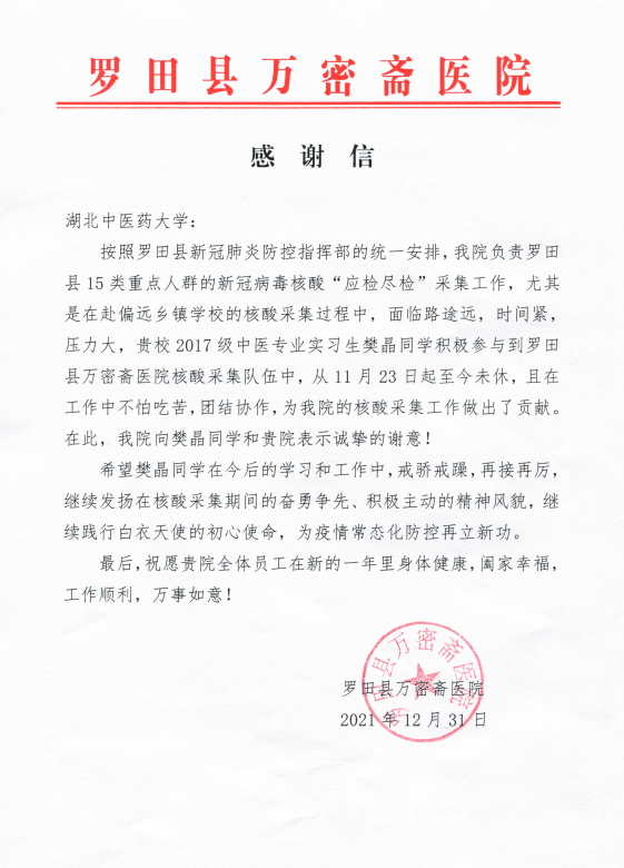 本网讯 近日,中医临床学院收到罗田县万密斋医院发来的感谢信。信中提道,学院2017级中医学(4)班樊晶同学积极参与罗田县15类重点人群的新冠病毒核酸“应检尽检”采集工作,不怕吃苦、勇于担当,为罗田县万密斋医院的核酸采集工作作出了贡献。