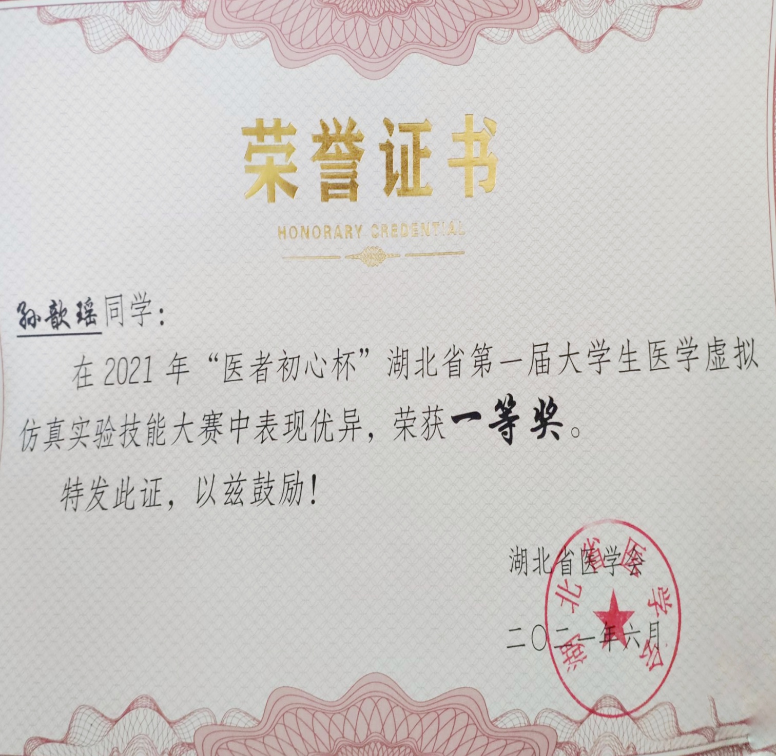 2018级中西医临床专业学生孙歆瑶获2021年“医者初心杯”湖北省第一届大学生医学虚拟仿真实验技能大赛一等奖