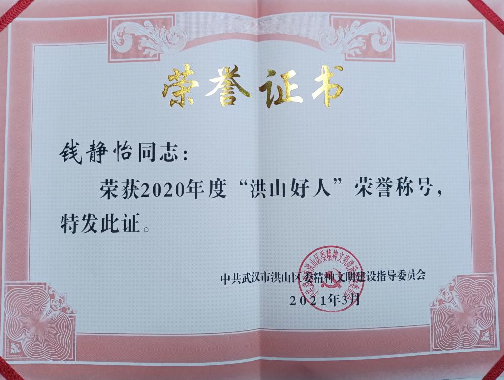 2019级中西医结合专业硕士研究生钱静怡获“洪山好人”称号