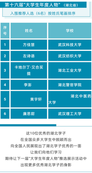 3. 2018级中西医临床专业学生黄宇轩入围第十六届“中国大学生年度人物”候选人。2019级中西医结合专业硕士研究生钱静怡获“洪山好人”称号。