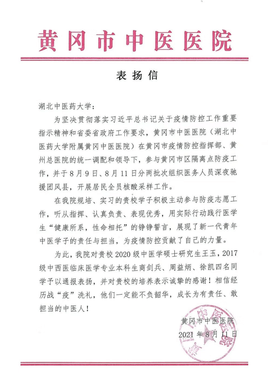 7.2020级硕士研究生王玉参与黄冈市中医医院驰援团风县开展居民全员核酸采样的志愿服务工作,协助维护现场秩序、测量体温、搬运物资等。黄冈市中医医院向学校发来表扬信。2017级中医学(4)班学生樊晶参与罗田县15类重点人群的新冠病毒核酸“应检尽检”采集工作,勤恳踏实的态度受到医院领导和带教老师的高度认可。罗田县万密斋医院向学校发来感谢信。