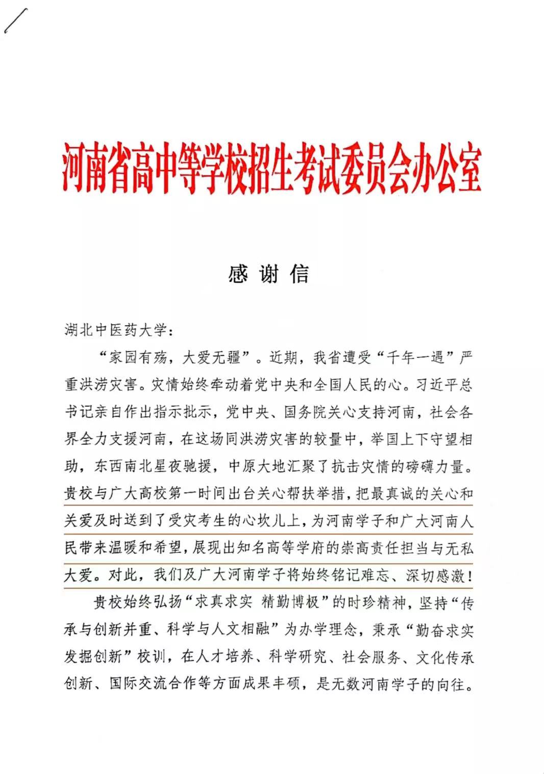6.针对河南省多地遭受严重洪涝灾害情况,专门调拨该省本科一批次计划作为救灾专项计划,增至106人。河南省招生办公室发来感谢信。