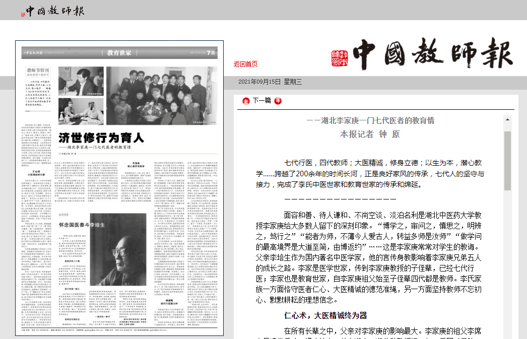 1.李家庚教授家庭获评全国首批教育世家,作为湖北省唯一优秀教师代表到北京参加教师节专项活动,受到孙春兰副总理亲切接见。