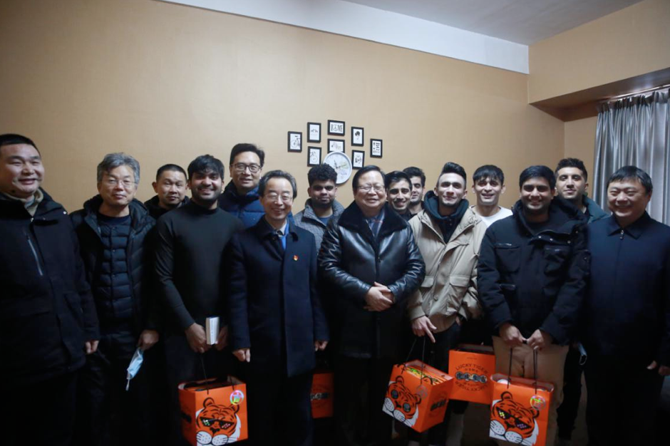 吕文亮详细了解因疫情影响而留校的学生住宿、学习、生活情况,有针对性地给予指导,嘱托同学们合理安排留校期间的学习生活,保持乐观向上的心态,一方面要严格遵守疫情防控各项规定,切实做好个人防护,注意人身安全;另一方面要充分利用假期,多读书“充电”、多锻炼身体,度过一个有意义的寒假。吕文亮提醒同学们要保持与老师的沟通交流,遇到困难及时反馈,学校会竭尽全力为大家提供学习生活各方面的保障,确保大家在校期间的健康安全稳定。在留学生公寓,吕文亮一行走访看望了留校留学生,祝福大家度过平安愉快的寒假假期,让身处异国他乡的留学生们感受到学校的关怀与温暖,体验浓郁的“年味”。