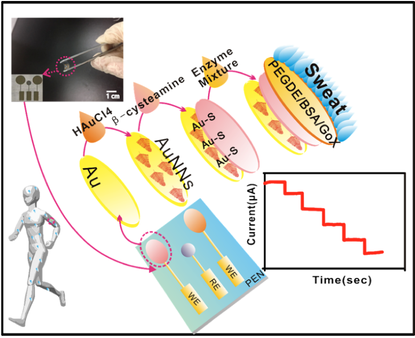 柔性电极用于皮肤汗液乳酸和葡萄糖实时监测示意图