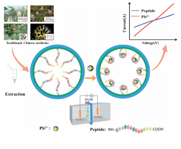 多肽修饰的纳米通道生物传感器用于中药中铅离子检测示意图